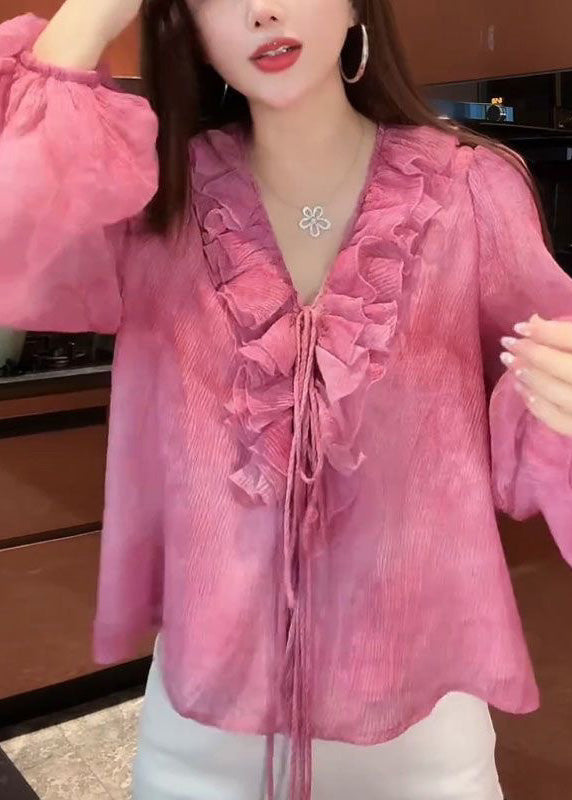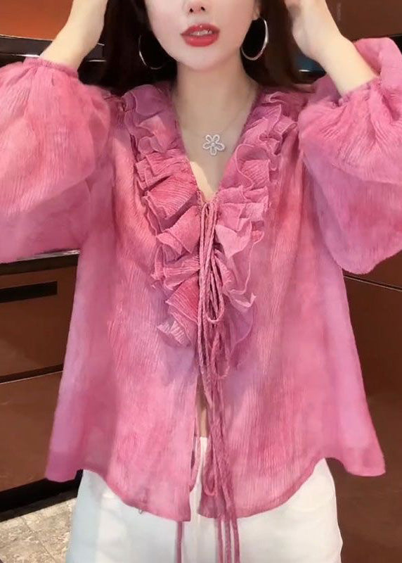 French Pink Tie Lace Floral Top Lantern Sleeve