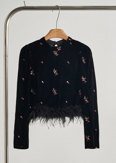 Boutique Black Embroidered Patchwork Feather Silk Velour Tops Fall