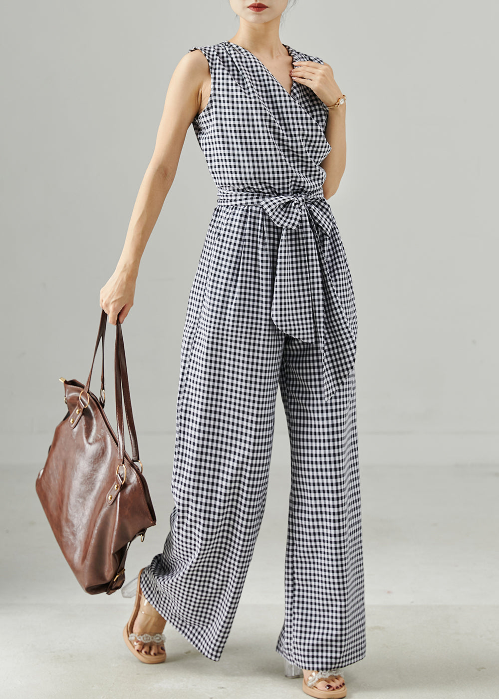 Modern Grey Plaid Tie Waist Cotton Jumpsuit Summer