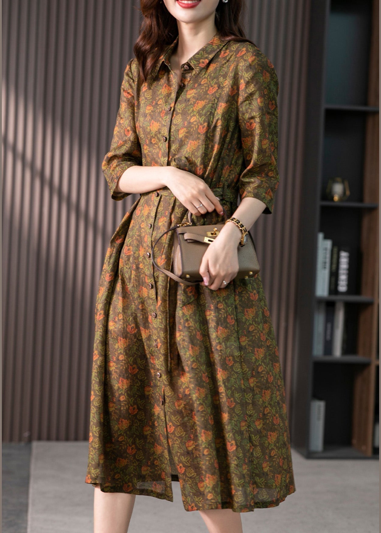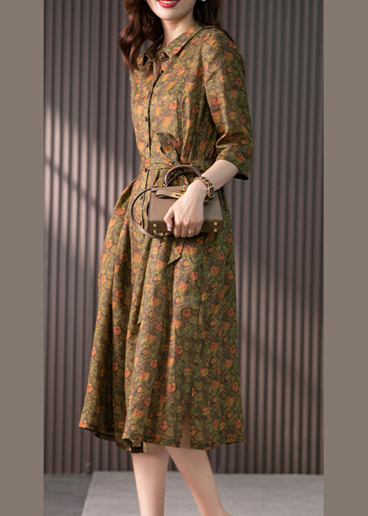 Retro Peter Pan Collar Print Button Slim Linen Maxi Dress Half Sleeve
