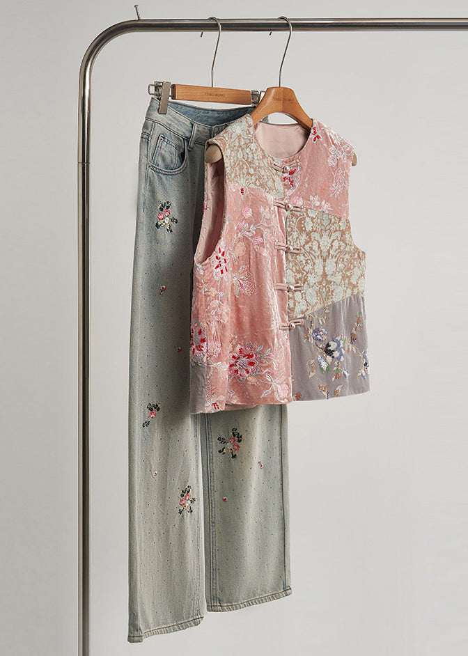 Art Pink Embroidered Nail Bead Silk Velour Oriental Vests Fall