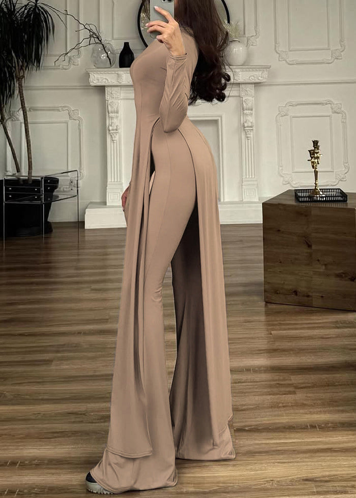 New Khaki O Neck Side Open Cotton Two-Piece Set Spring
