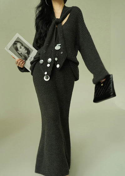 Loose Grey V Neck Sequins Knit Two Pieces Set Fall
