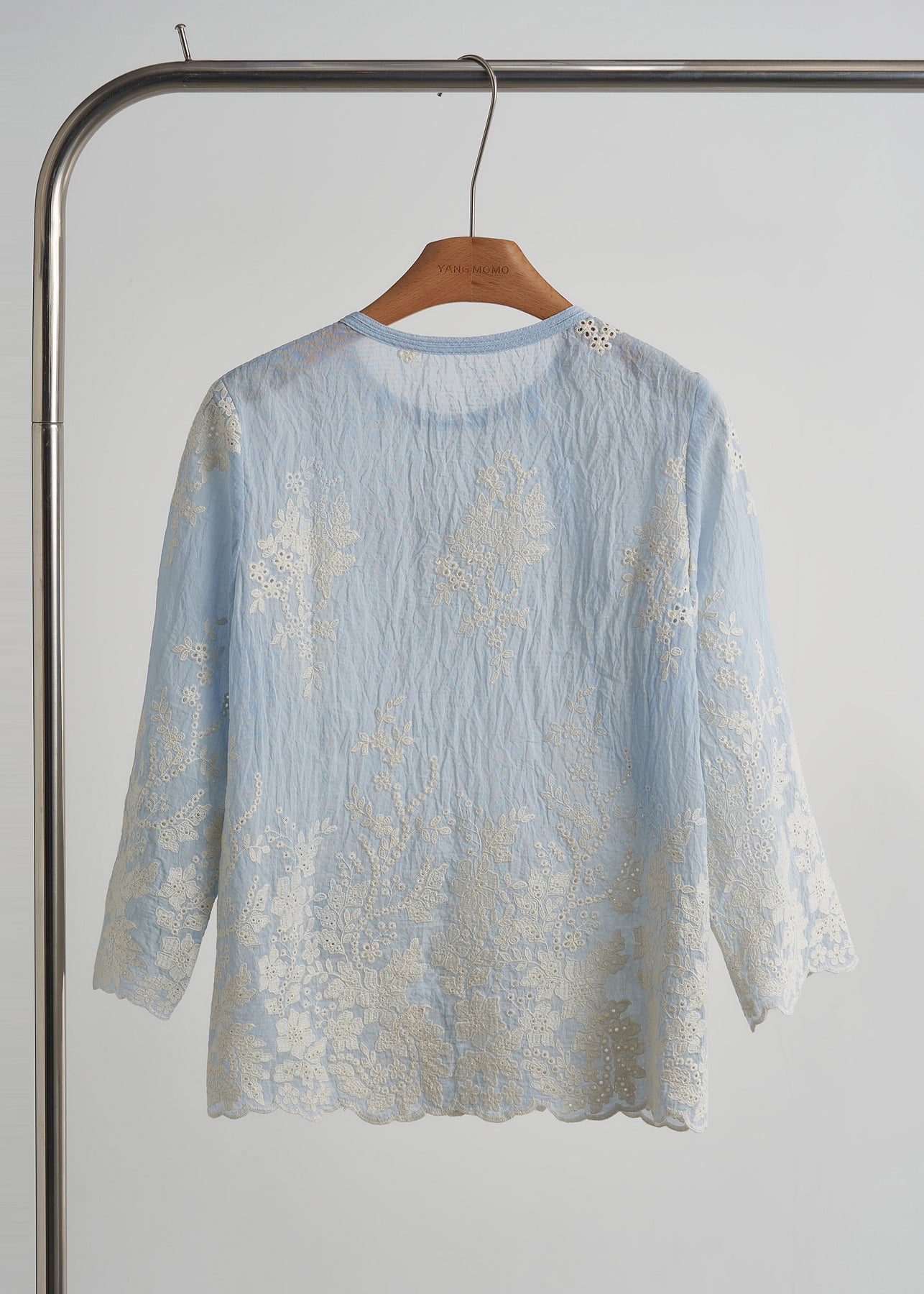 Elegant Sky Blue Embroidered Cotton Tops Fall