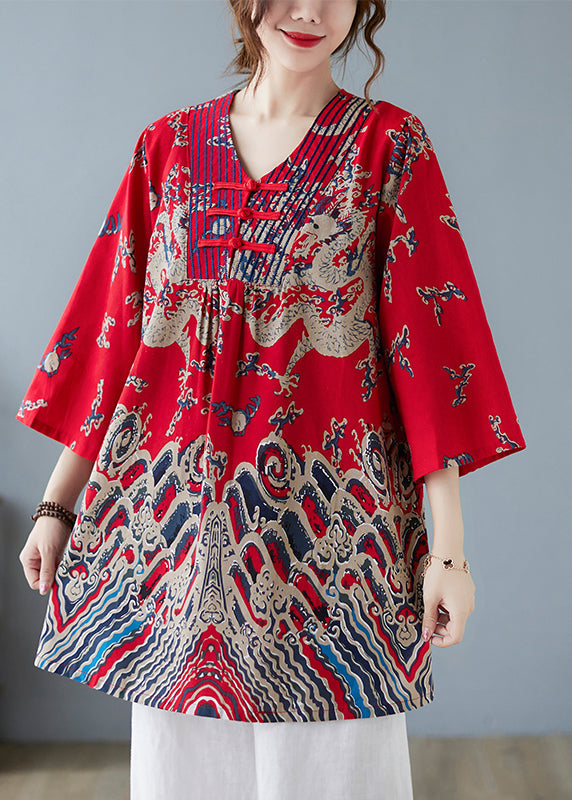 Plus Size Red V Neck Print Top Spring