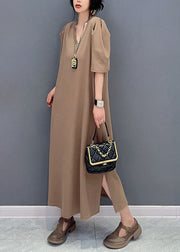 Simple Khaki V Neck Side Open Patchwork Cotton Dresses Summer