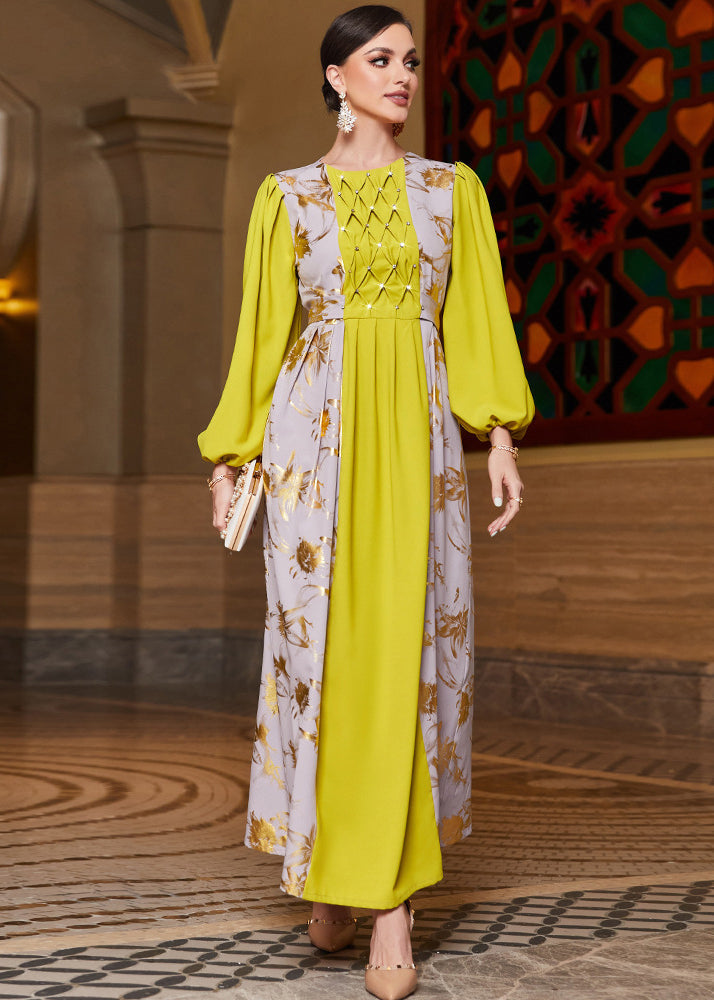 Modern Yellow Print Patchwork Wrinkled Sim Chiffon Long Dresses Fall