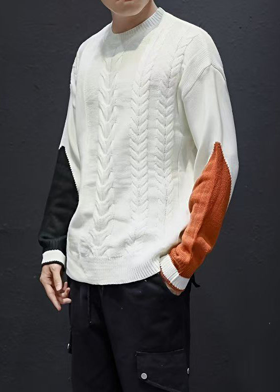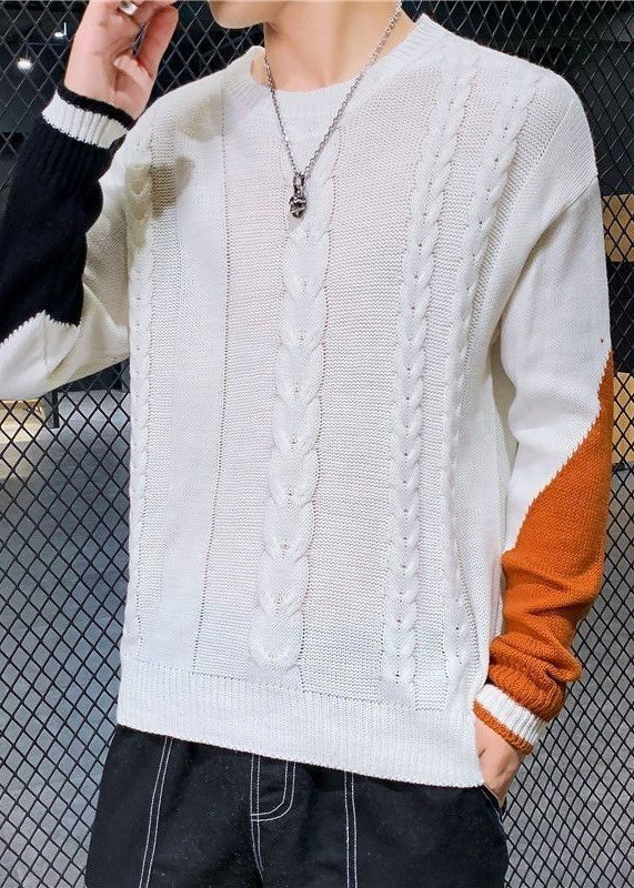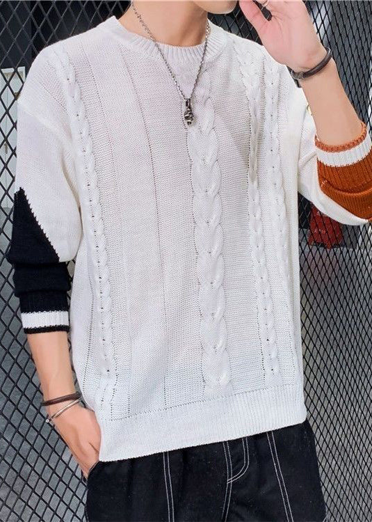 New White Asymmetrical Patchwork Cable Knit Men Sweaters Spring