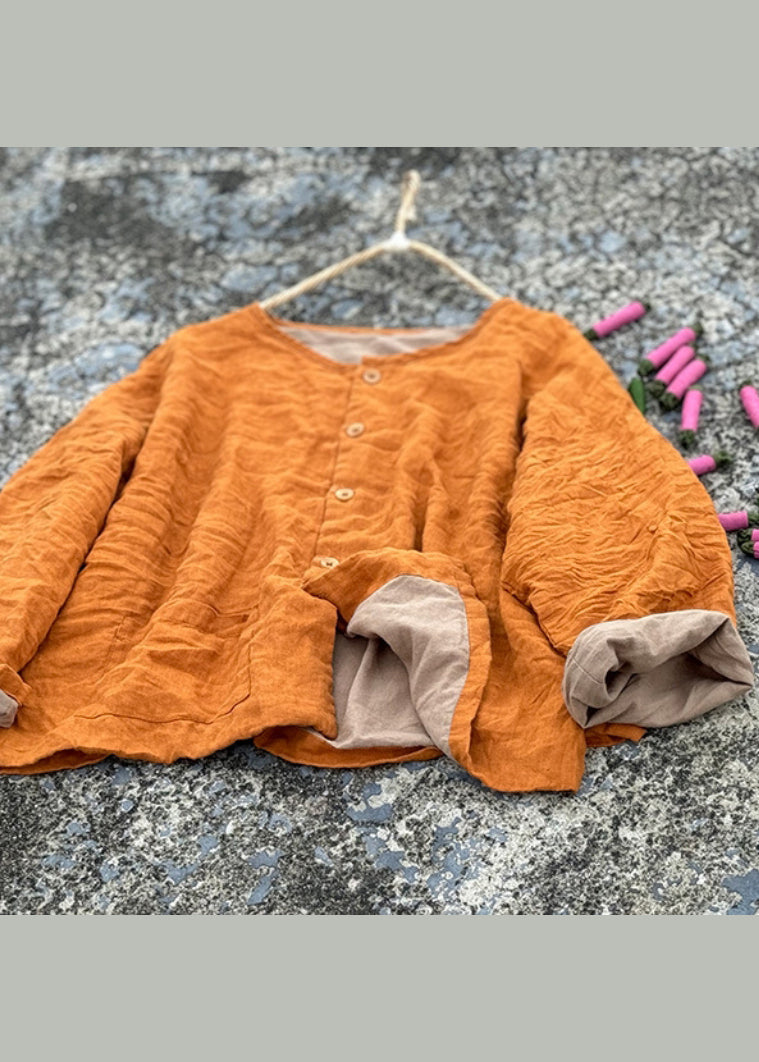 Women Green O Neck Pockets Button Linen Loose Coat Fall