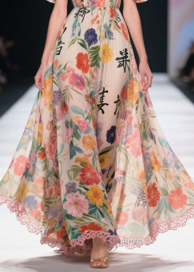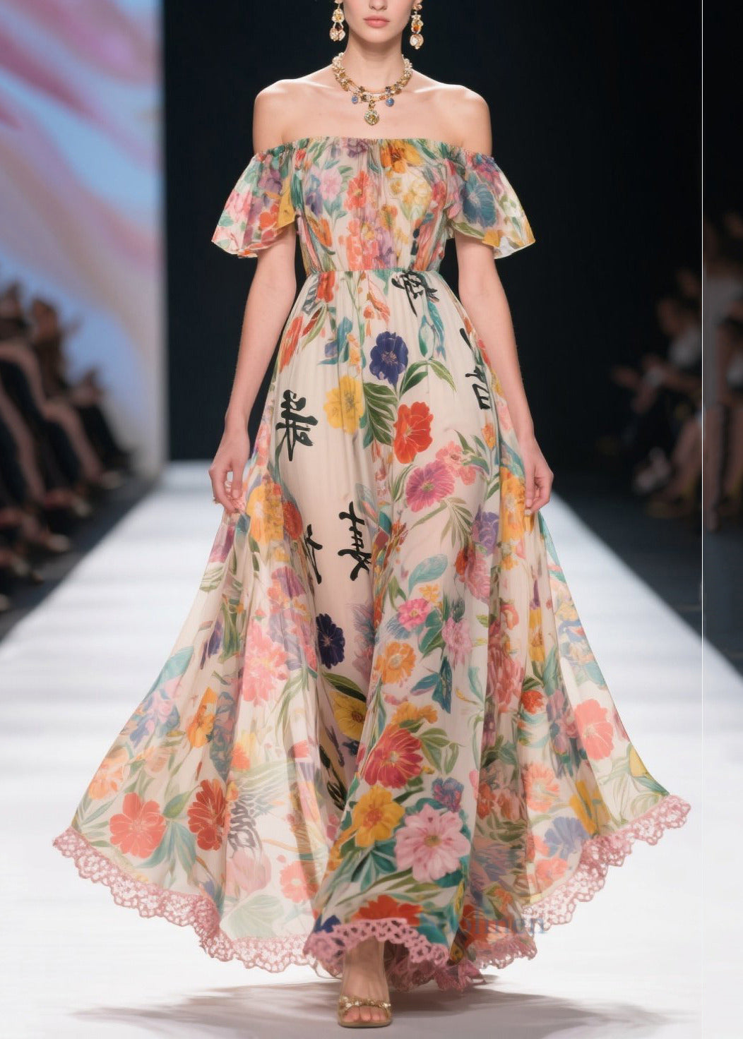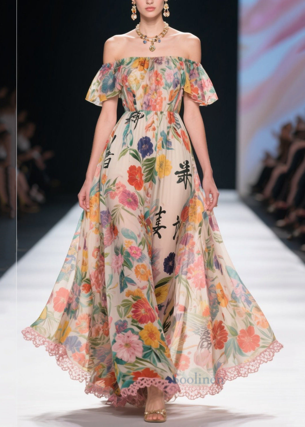 Casual Khaki Cold Shoulder Print Chiffon Beach Dresses Summer