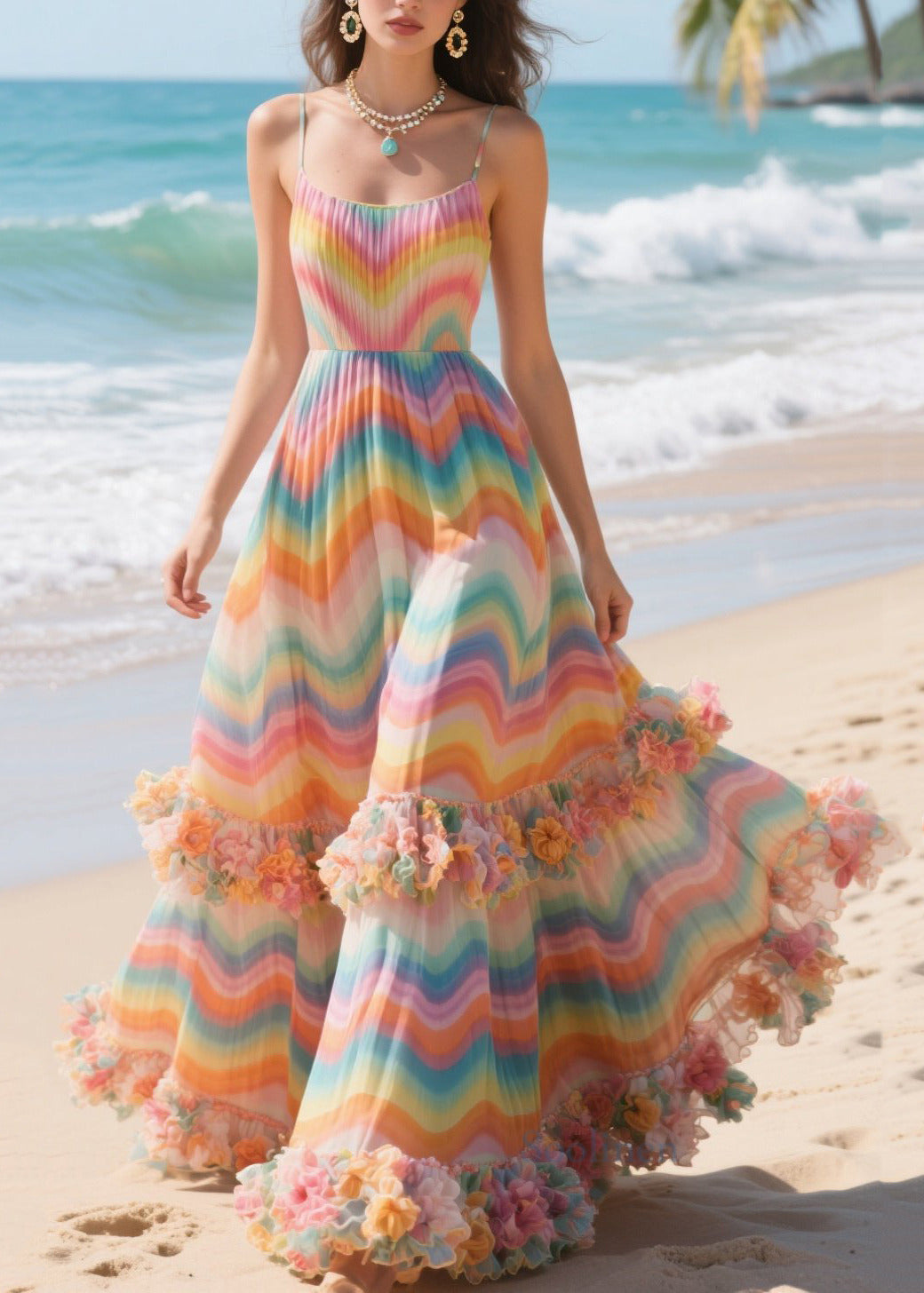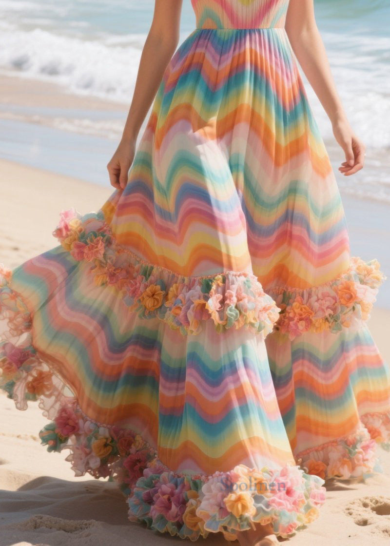 Chic Rainbow Striped Three-dimensional Flower Chiffon Long Dress Summer