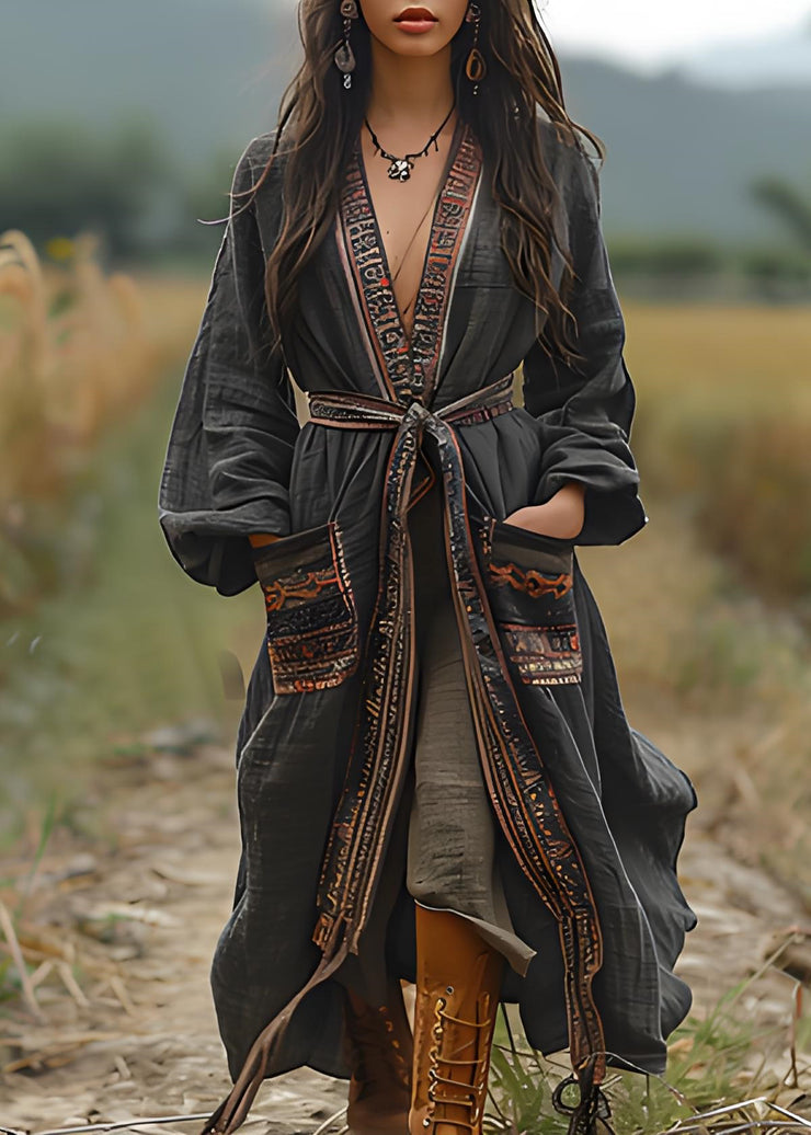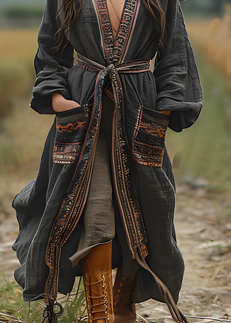 Bohemian Black Print Pockets Cotton Loose Cardigans Spring