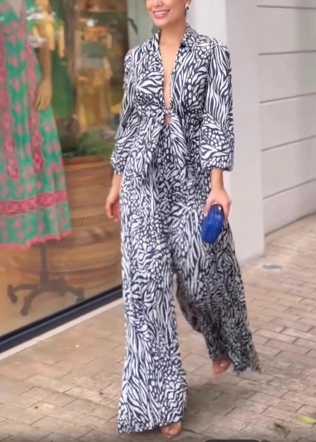 Sexy V Neck Print Wide Leg Jumpsuit Spring