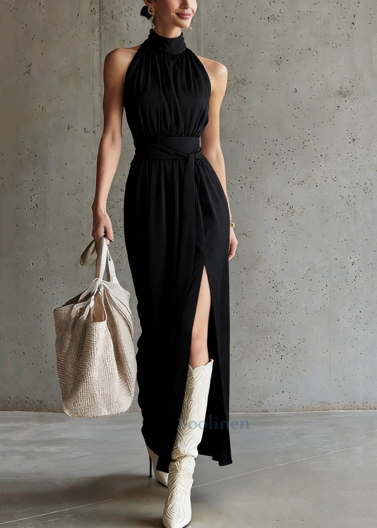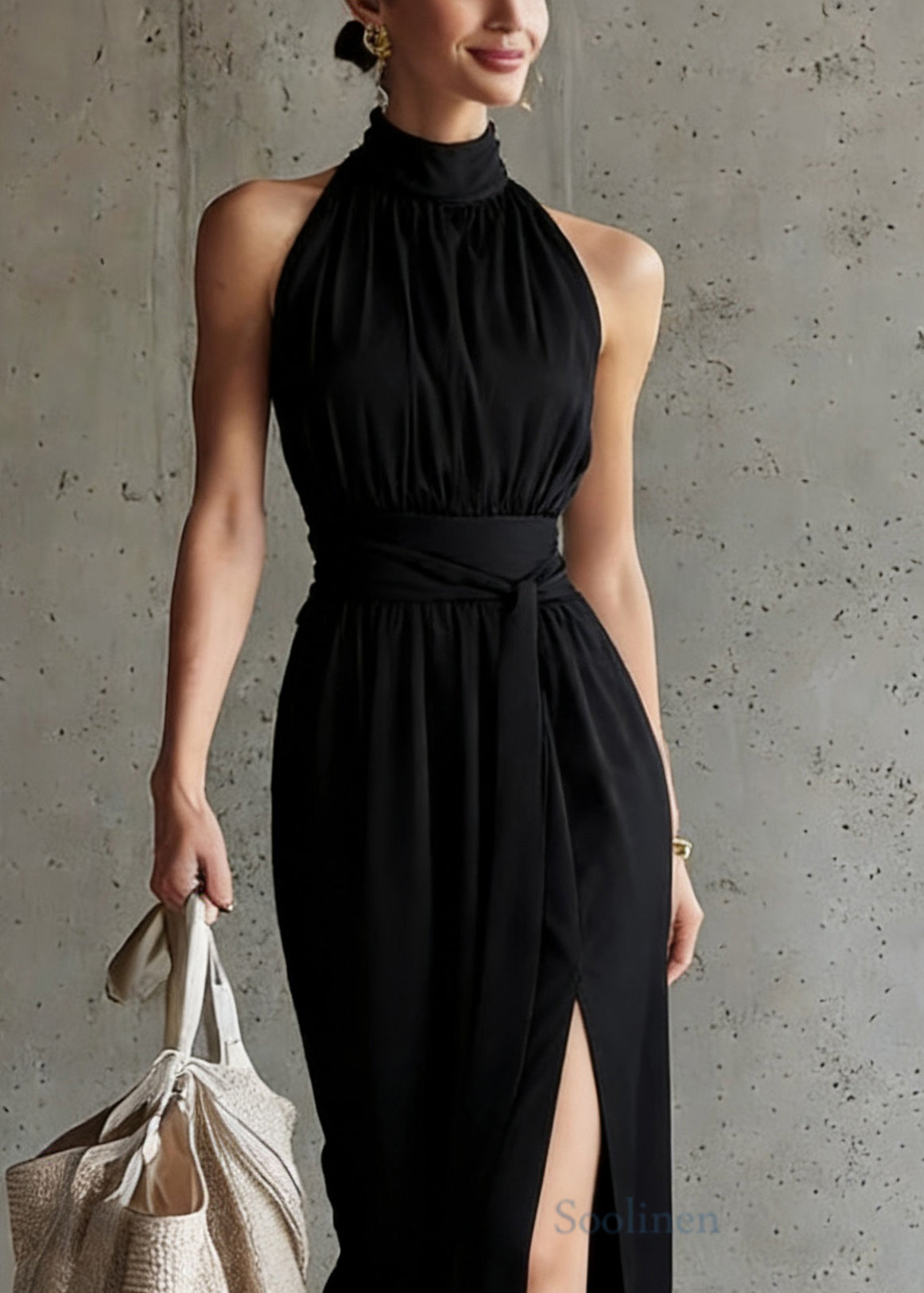 French Black Stand Collar Tunic Solid Maxi Dress Summer