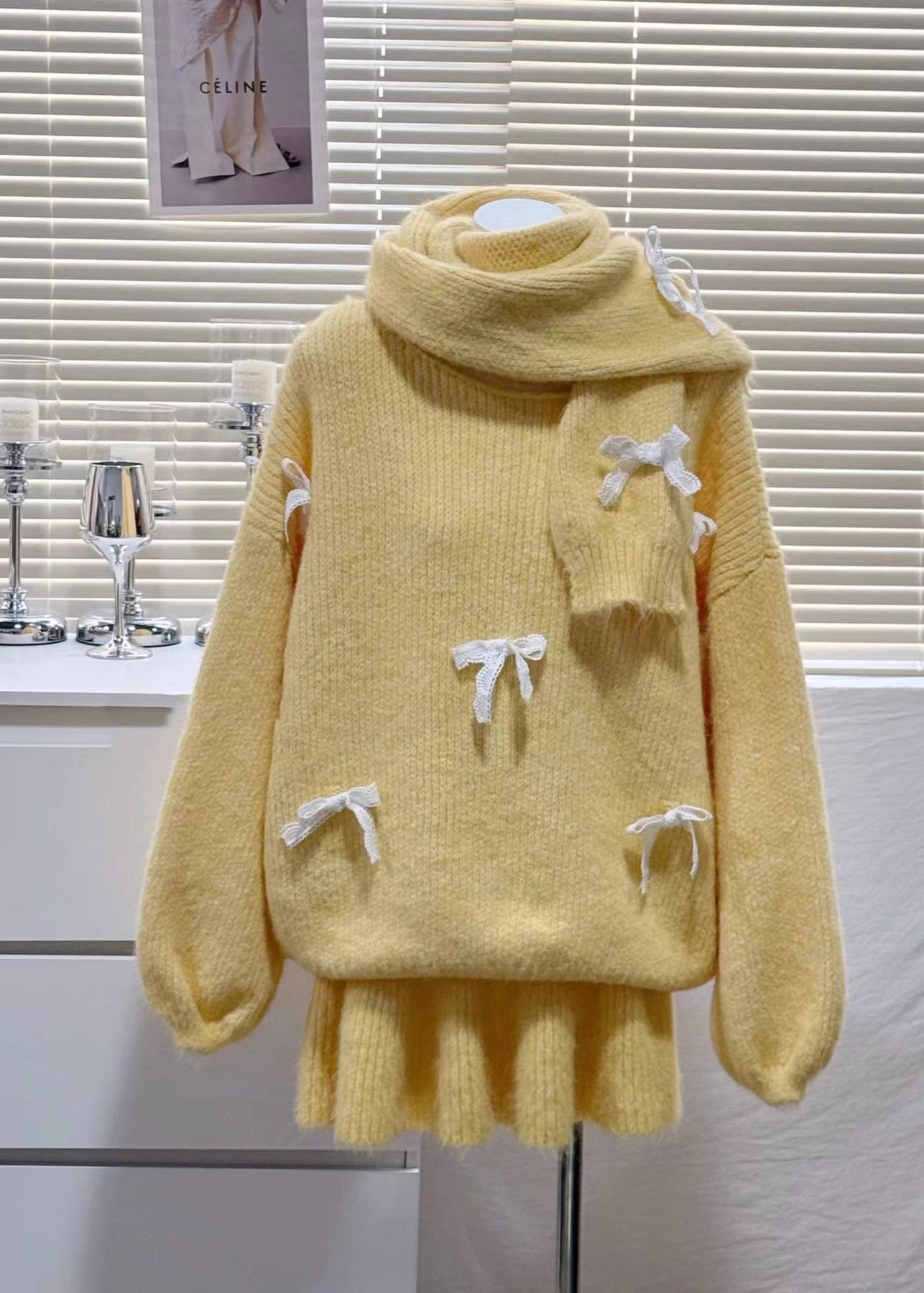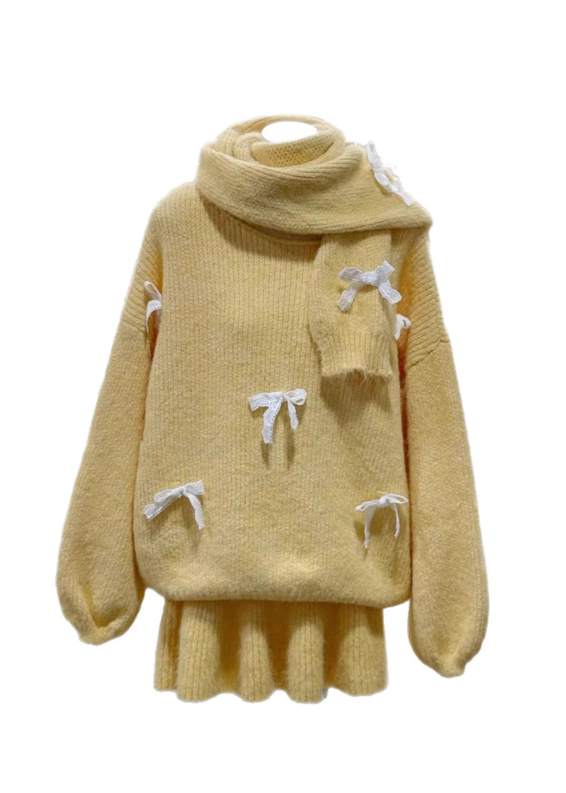Women Red Oversized Bow Knit Three-Piece Set Winter