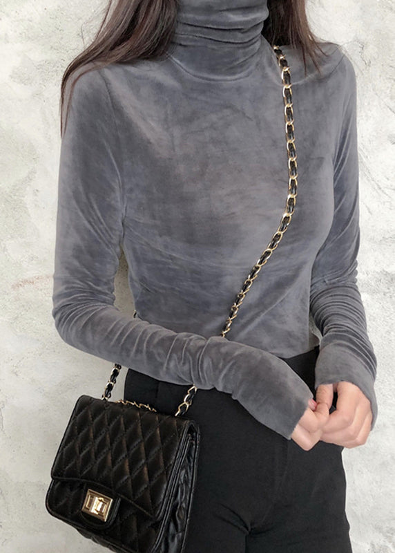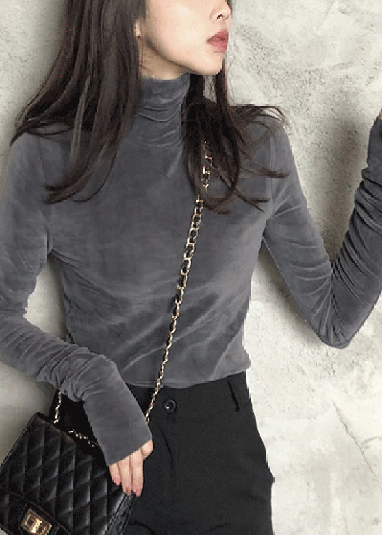 Stylish Dark Gray Turtleneck Warm Fleece Thick Velour Tops Fall
