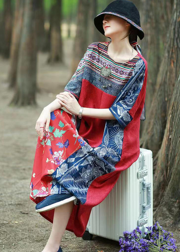 Unique Red Ethnic Style Patchwork Print Cotton Long Dress Short Sleeve