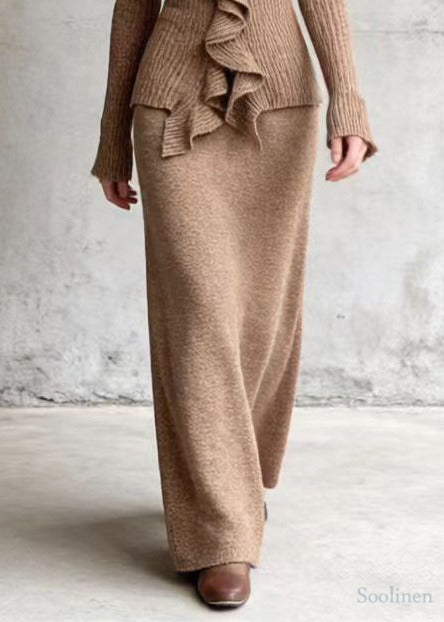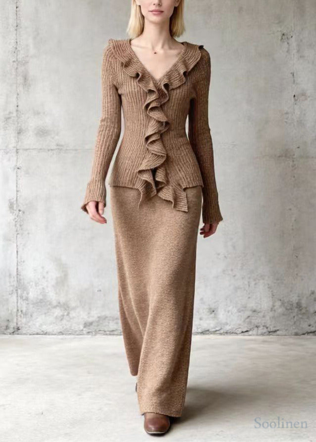 Casual Khaki Ruffled Silm Fit Knit Two Pieces Set Spring