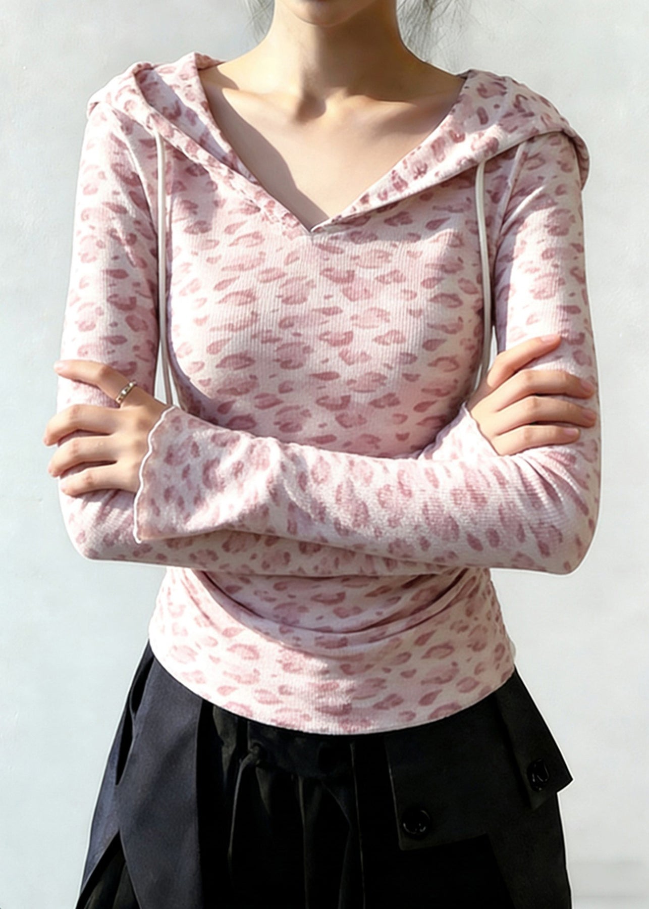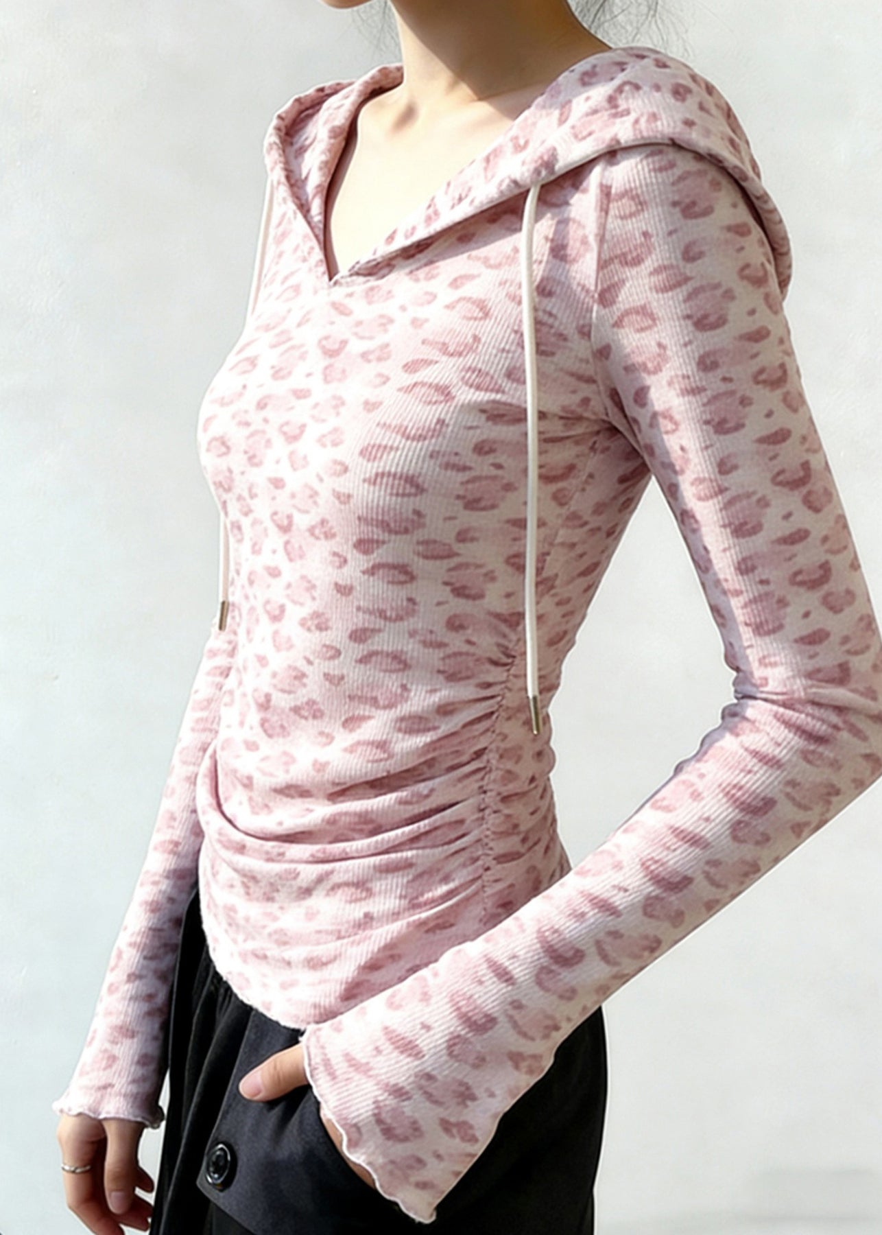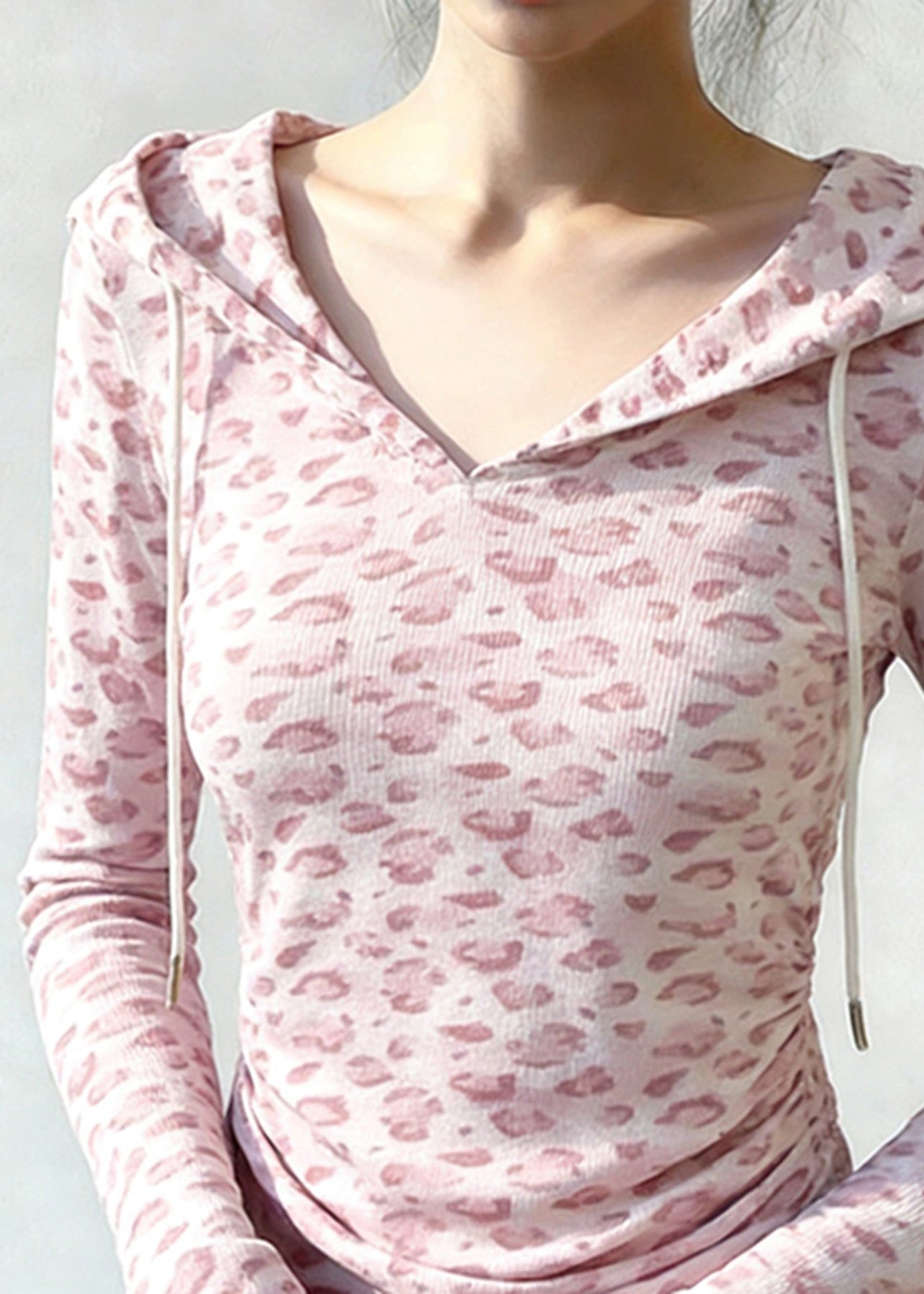 Chic Pink Hooded Leopard Print Cotton Sweatshirt Tops Spring