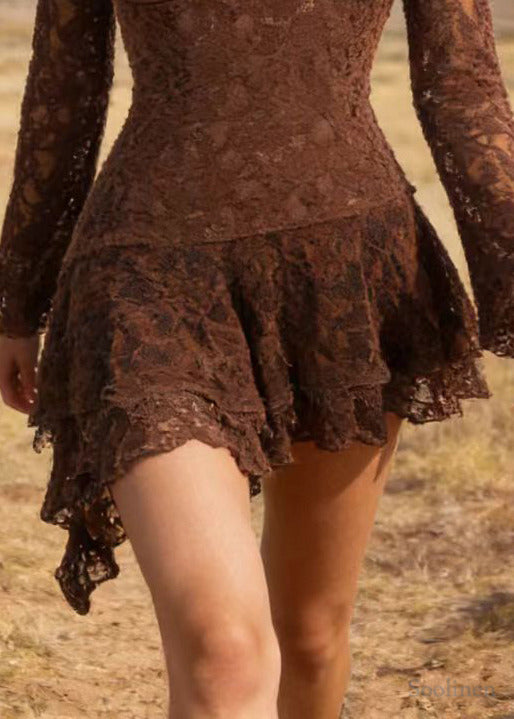 Fashion Brown Asymmetrical Patchwork Lace Mini Dress Spring