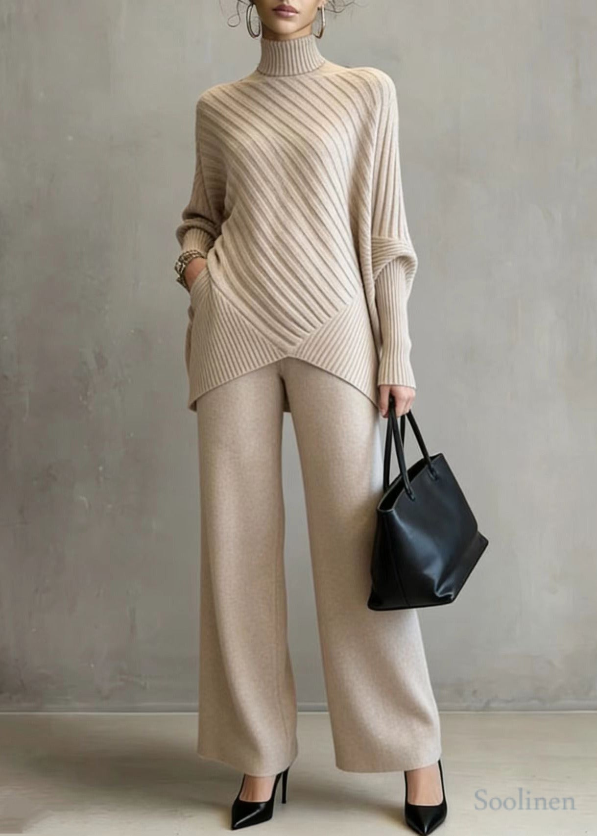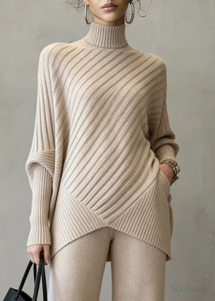 Fitted Khaki High Neck Asymmetrical Design Knit Two Pieces Set Spring