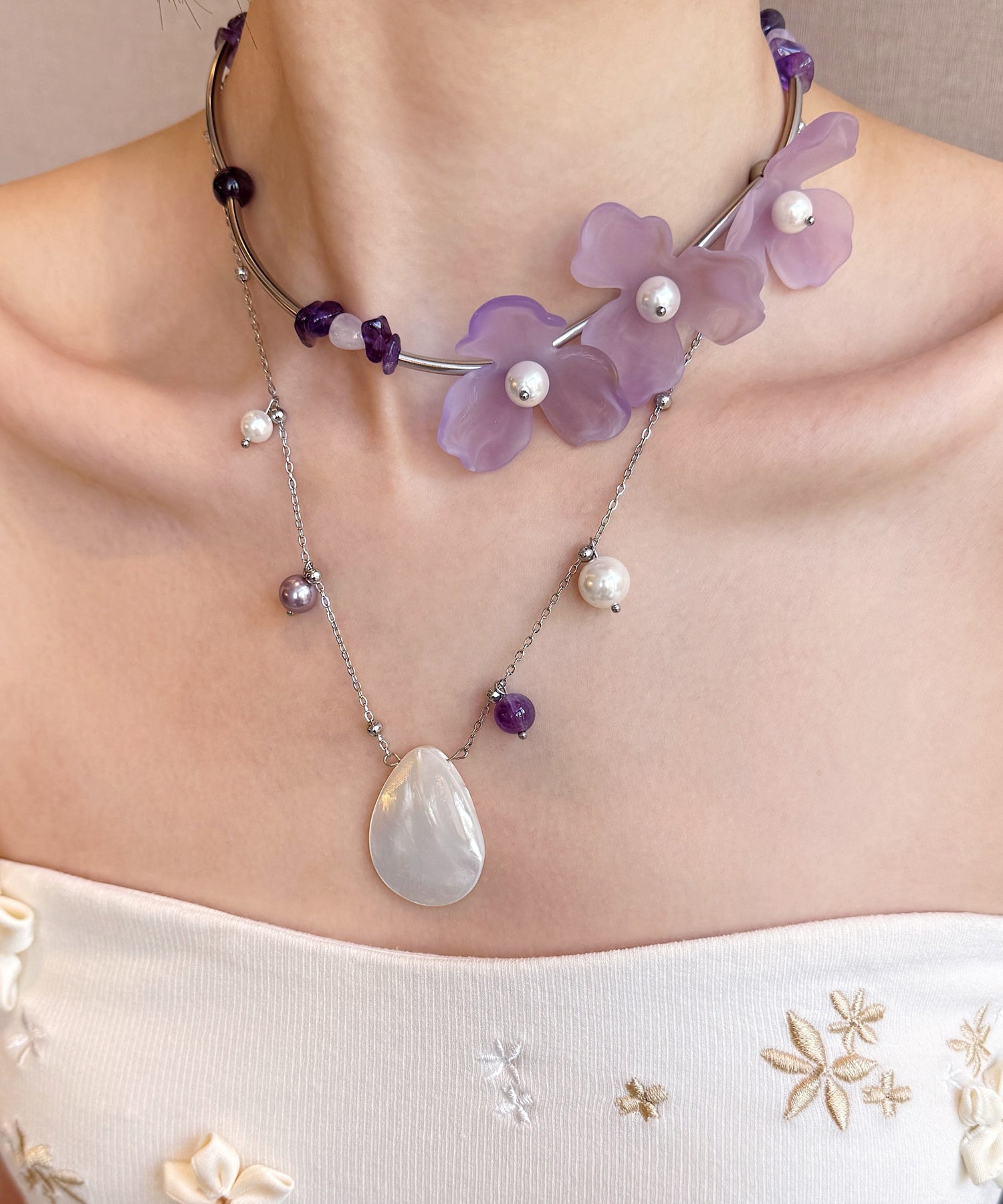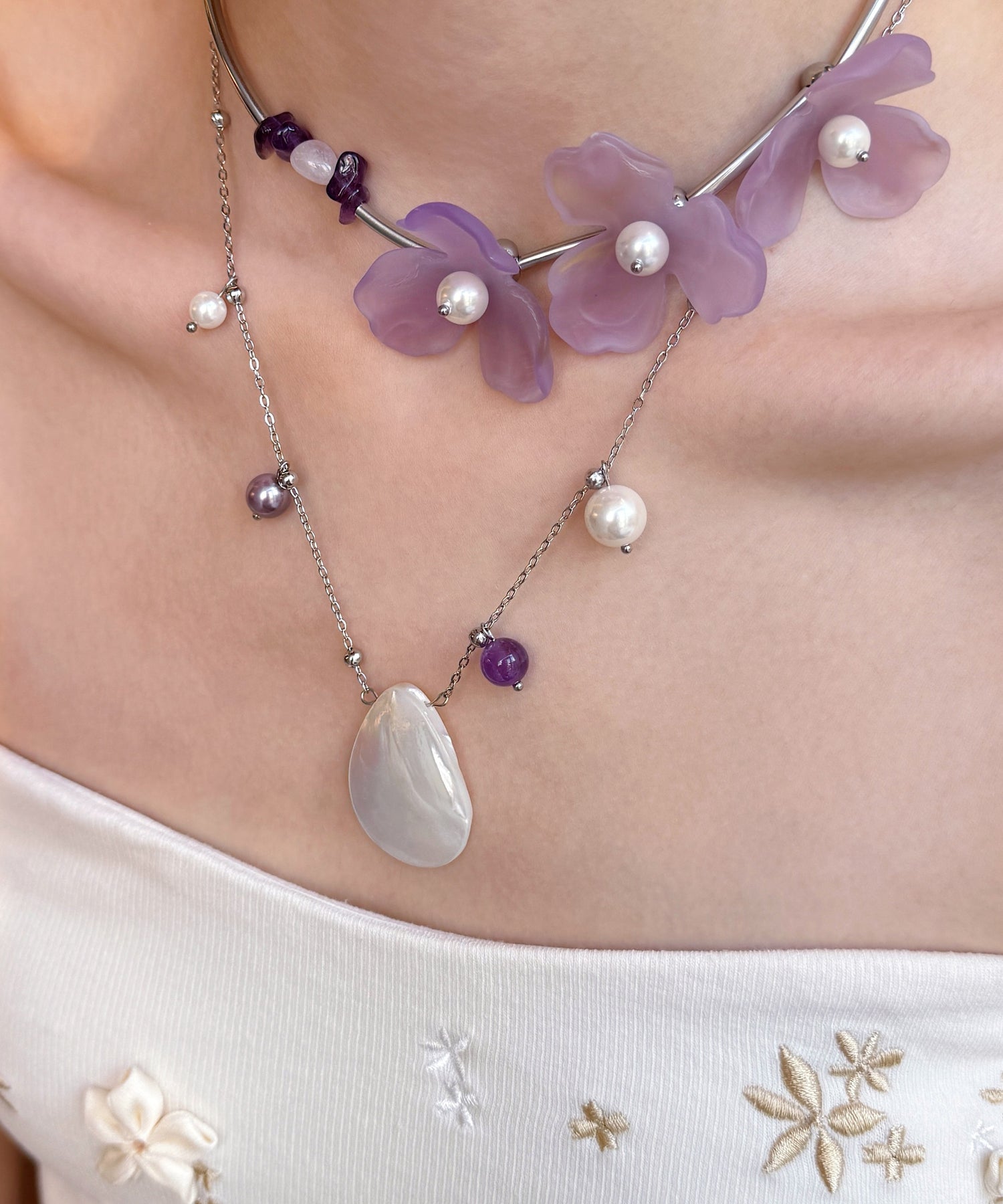 Floral Purple Pearl Shell Alloy Two Piece Set Pendant Necklace
