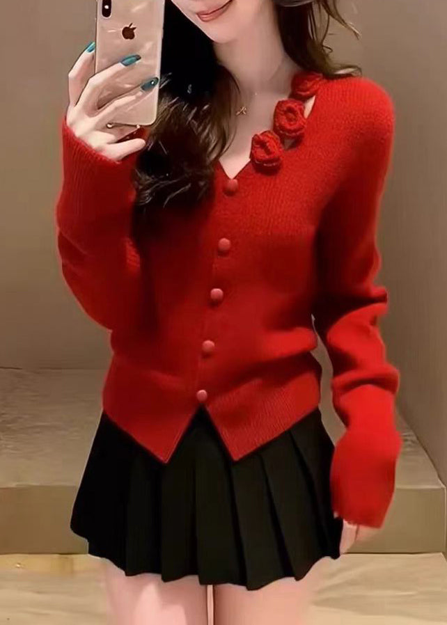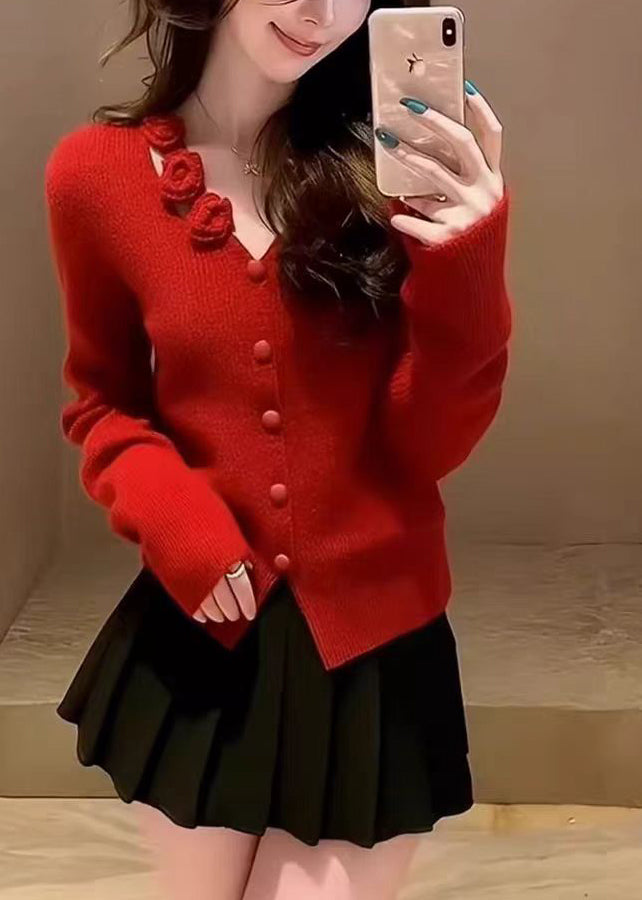 Organic Red Floral Button Cotton Knit Sweater Spring