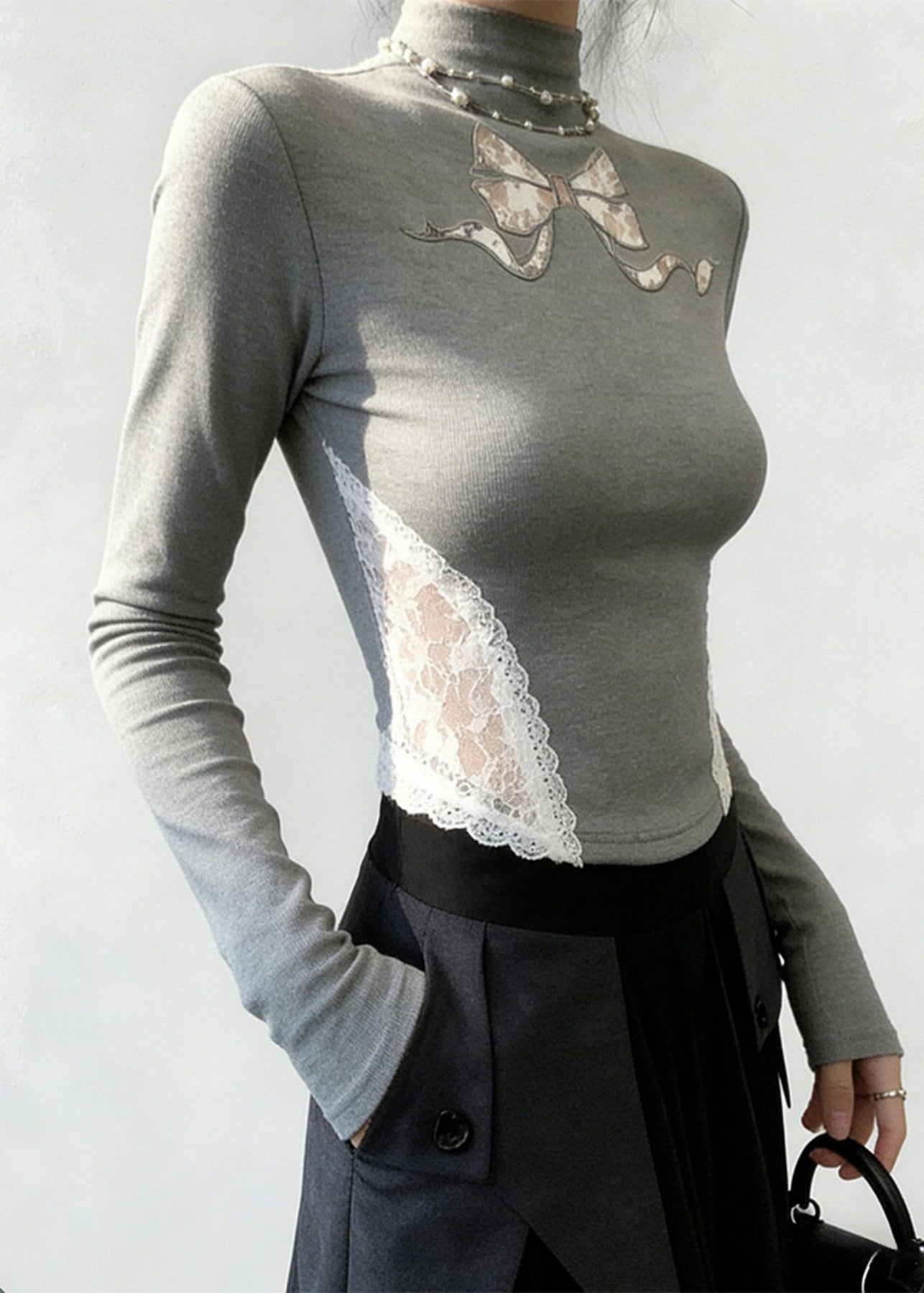 Classy Grey Stand Collar Patchwork Lace Tops Spring