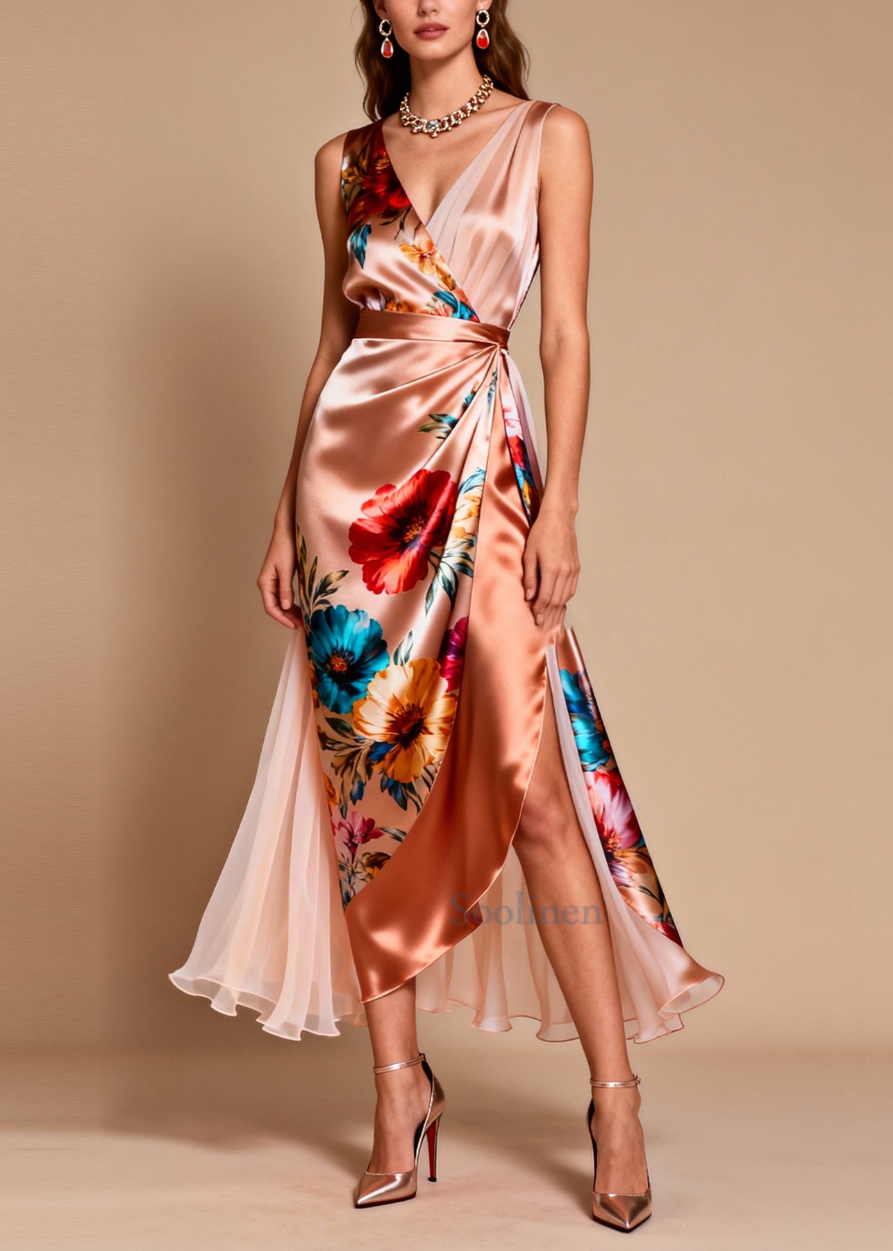 Modern Champagne Asymmetrical Patchwork Tulle Flower Print Dinner Dress Summer