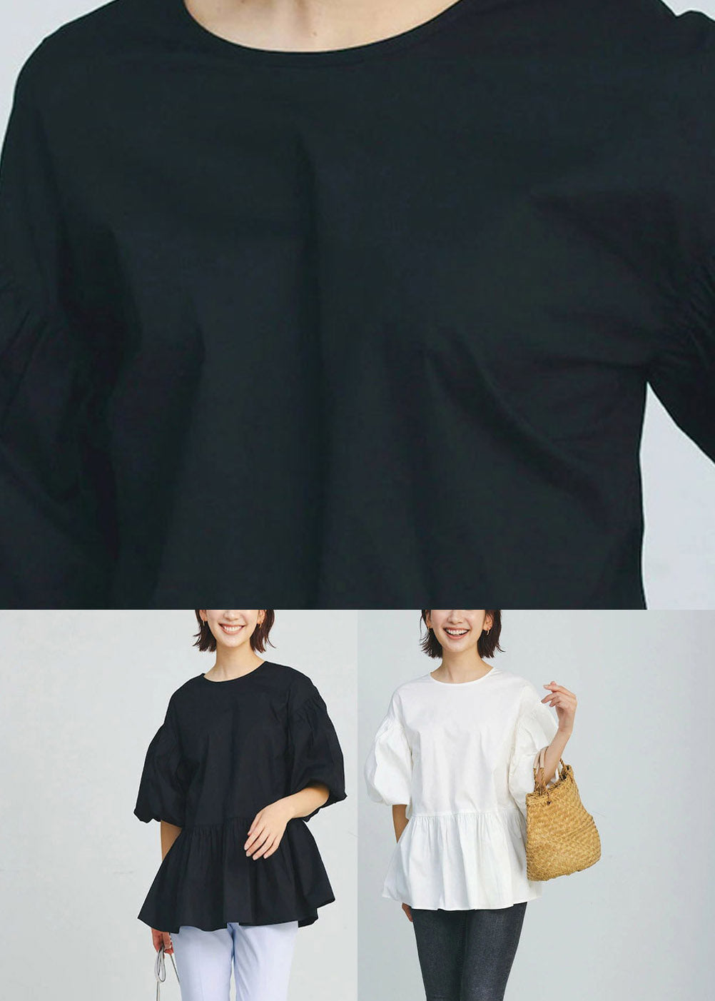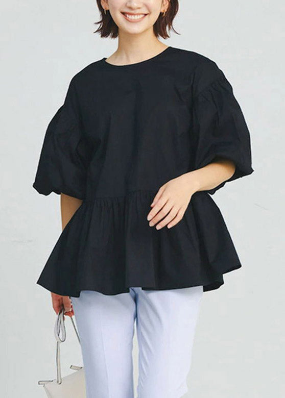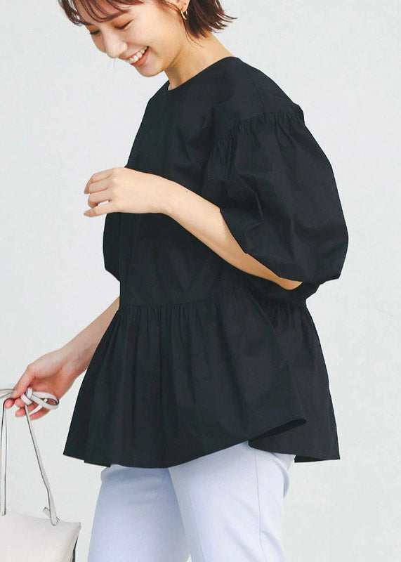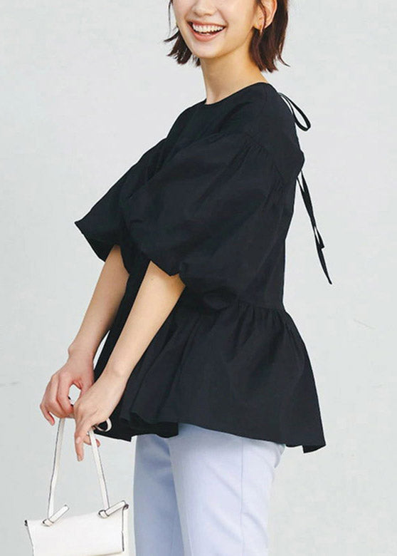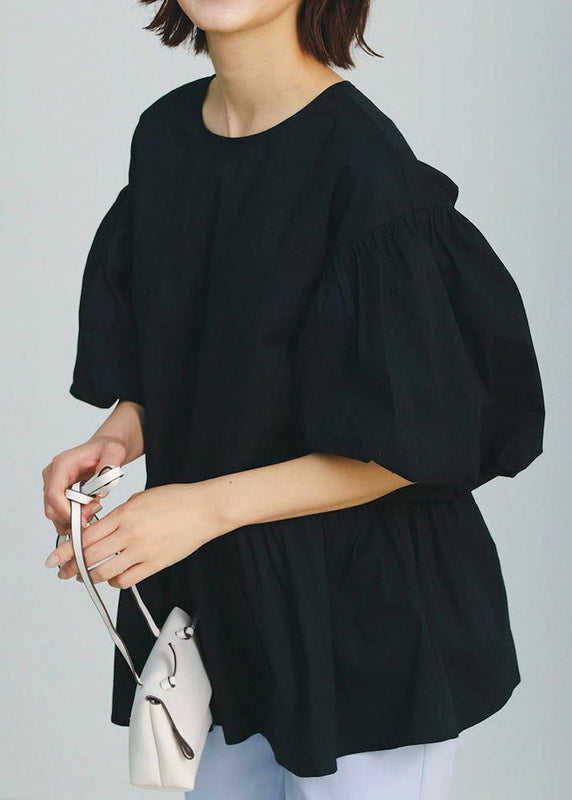 Black O-Neck Wrinkled Cotton Shirt Puff Sleeve