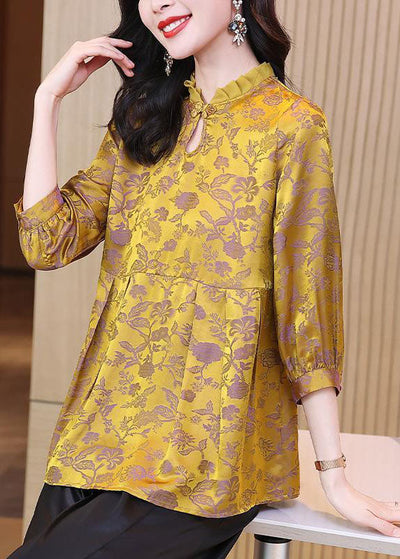 Women Yellow Ruffled Jacquard Silk Blouses Bracelet Sleeve