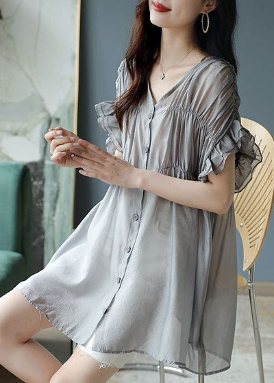 French Grey V Neck Ruffles Wrinkled Silk Blouse Tops Short Sleeve
