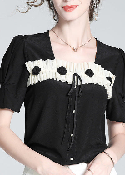 French Black Ruffled Patchwork Print Chiffon Shirts Tops Spring