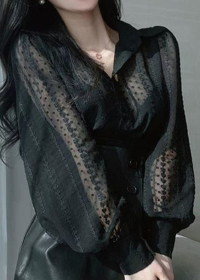 French Black Peter Pan Collar Lace Cotton Blouses Fall