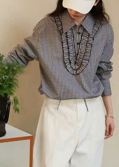 Loose Black Plaid Ruffled Cotton Blouses Fall