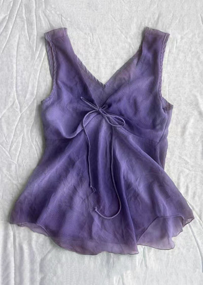 Simple Purple V Neck lace Up Solid Cotton Tank Sleeveless