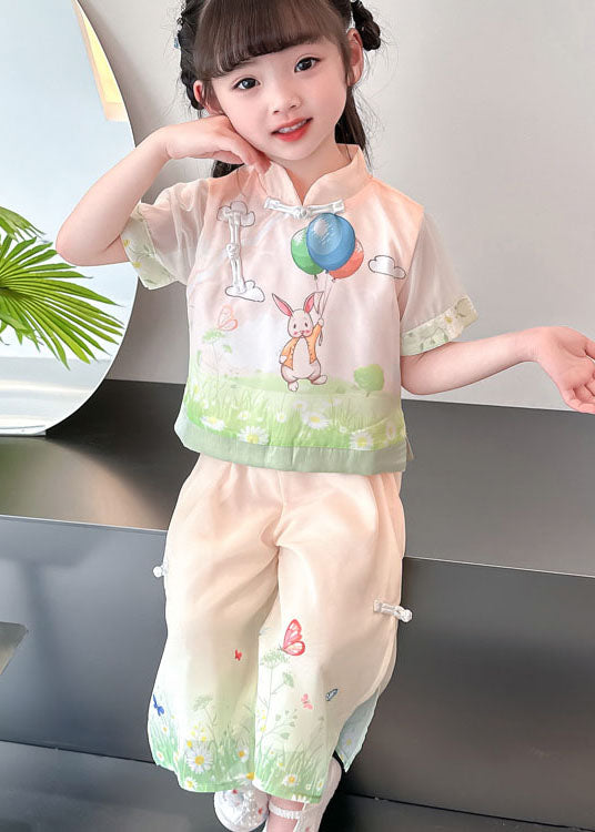Lovely Pink Chinese Button Print Patchwork Cotton Kids Girls Two Piece Suit Summer