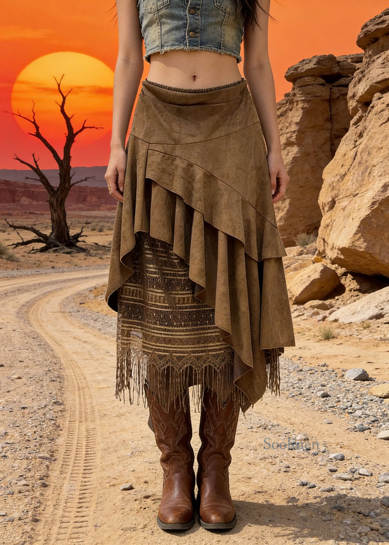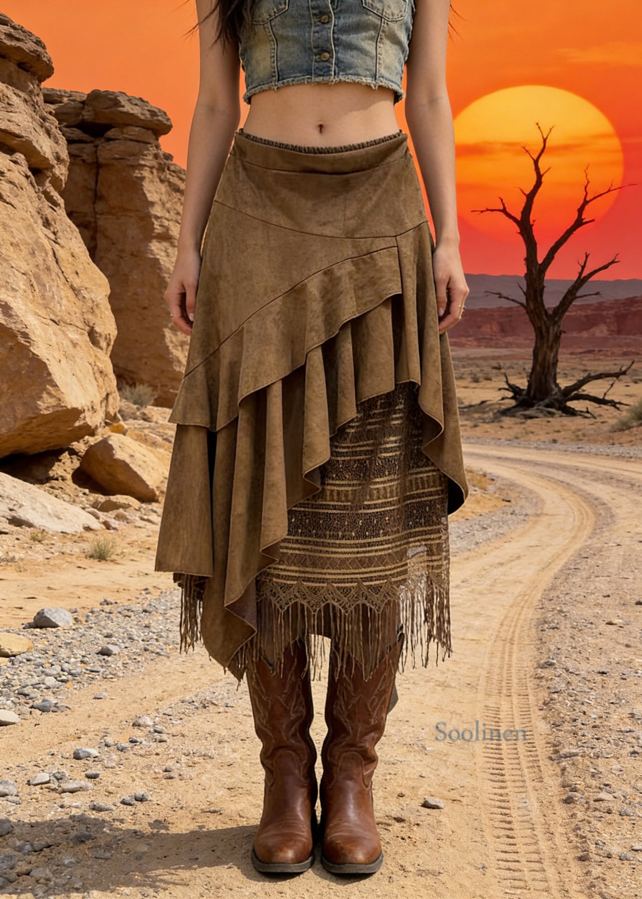 2026 New Khaki Asymmetrical Design Faux Suede Skirts Spring