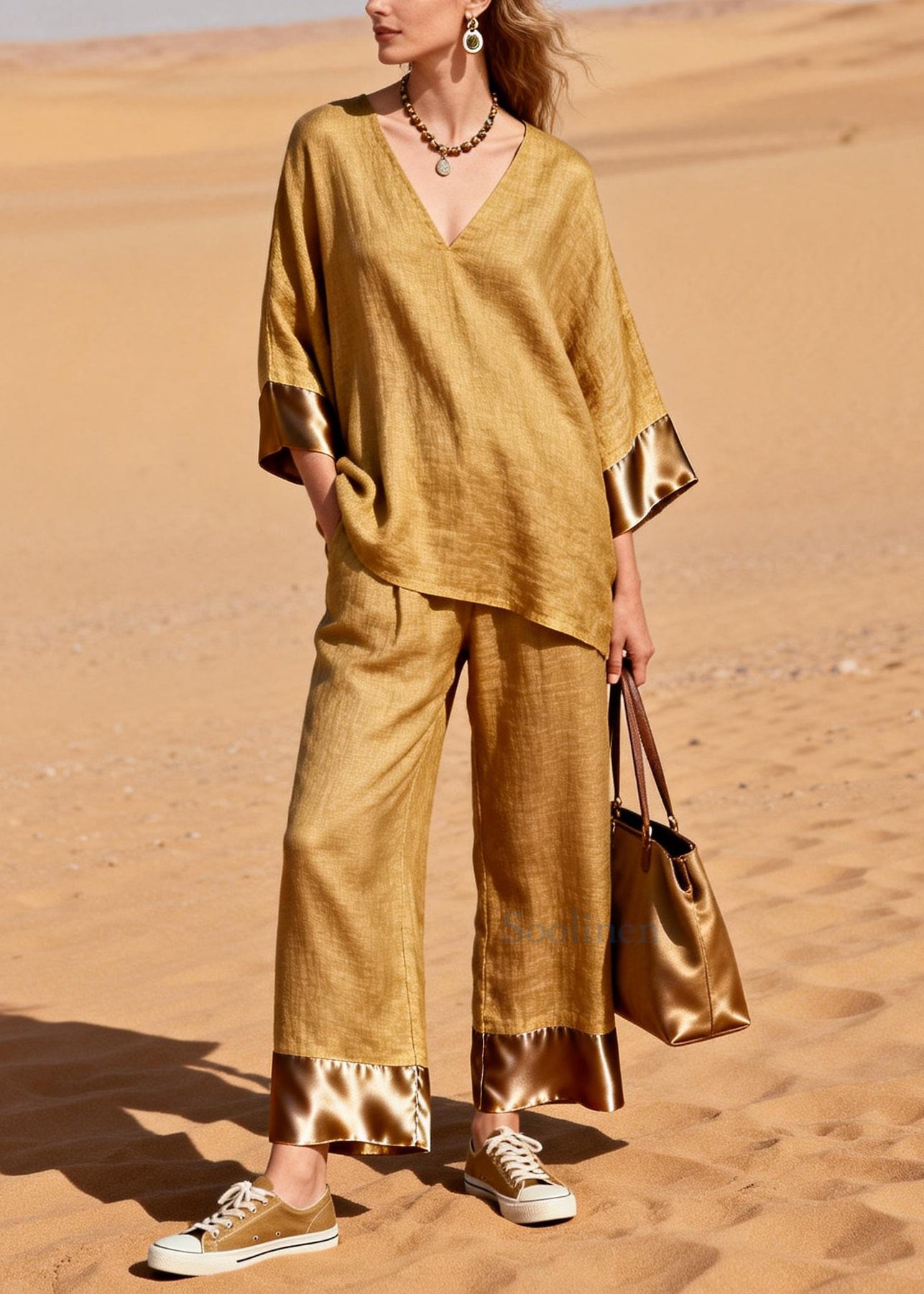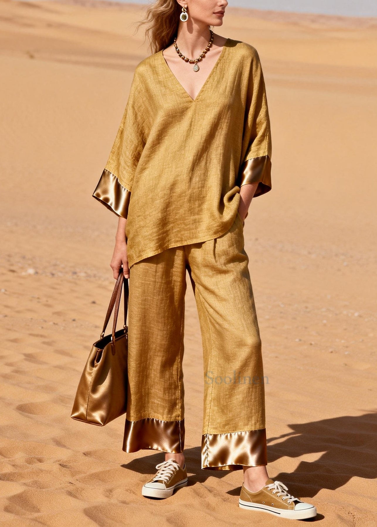 Art Yellow Oversized Patchwork Linen Two Pieces Set Spring
