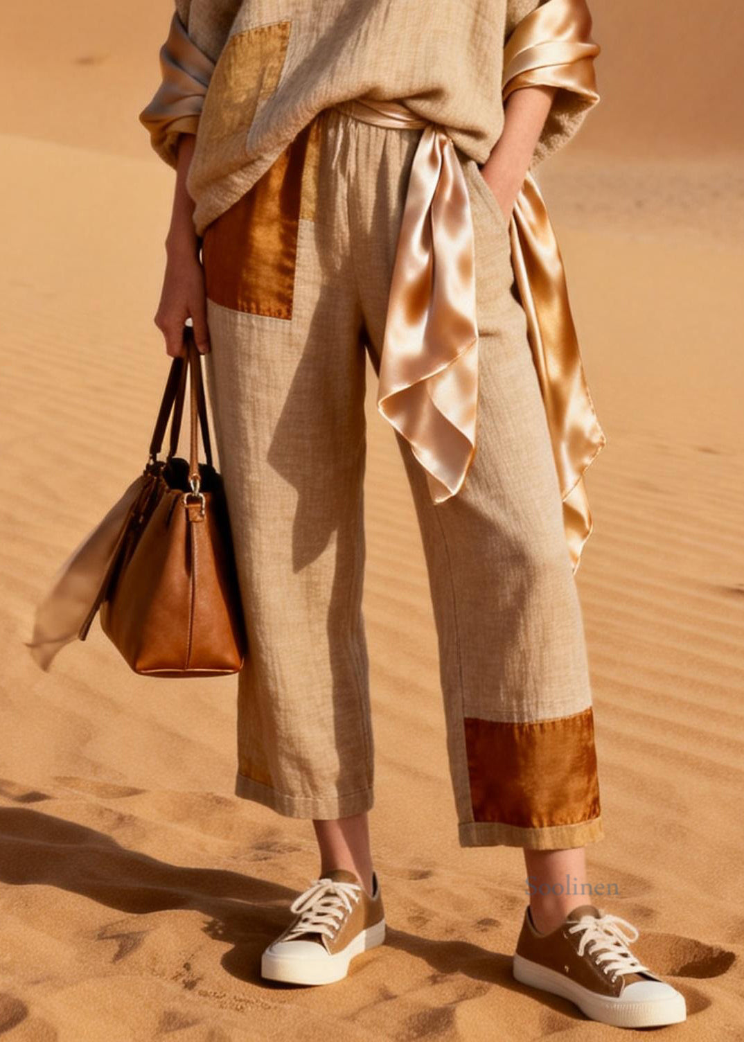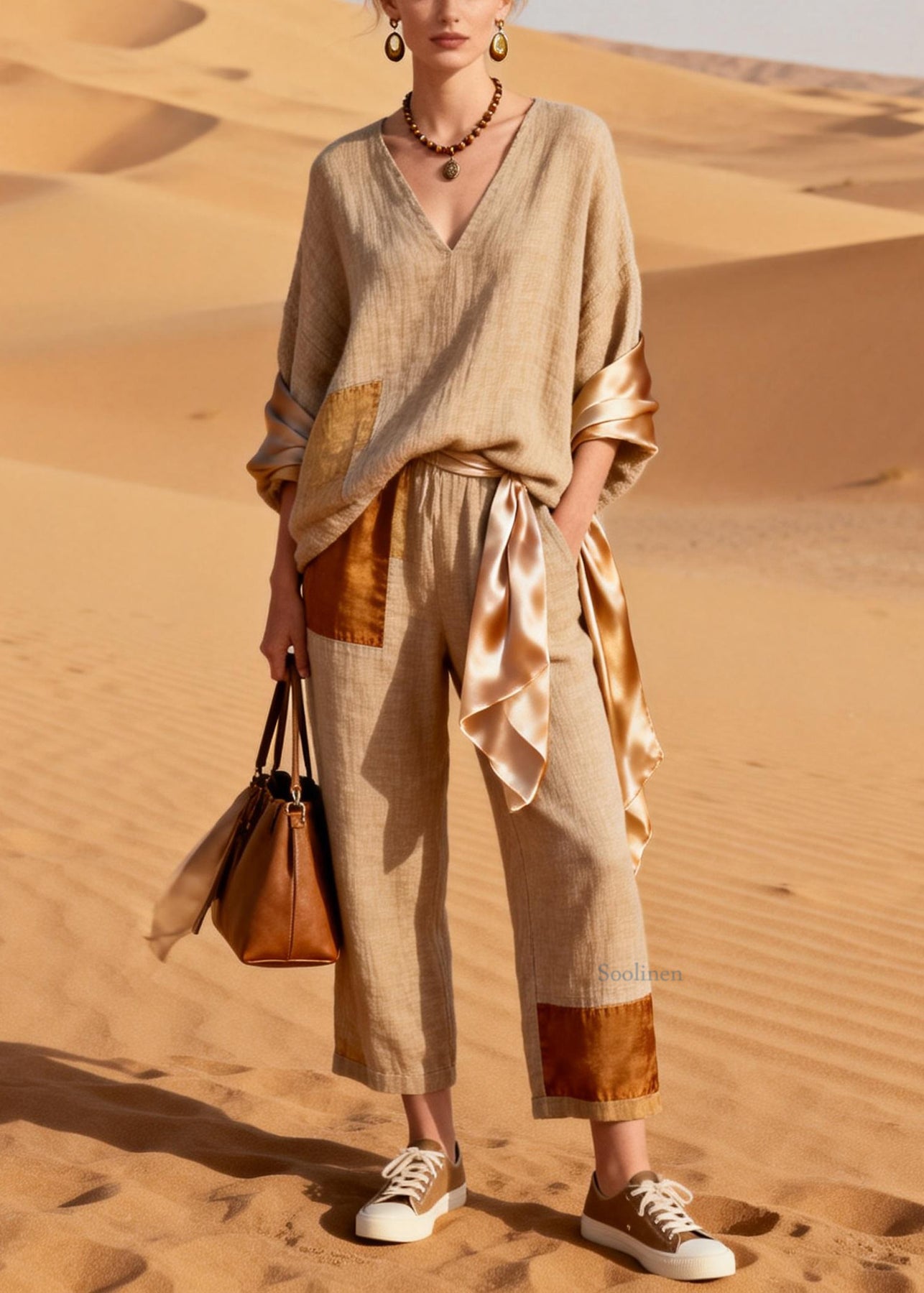 Asymmetrical Silk Patchwork T Shirt And Crop Pants Linen Two Piece Set V Neck Spring