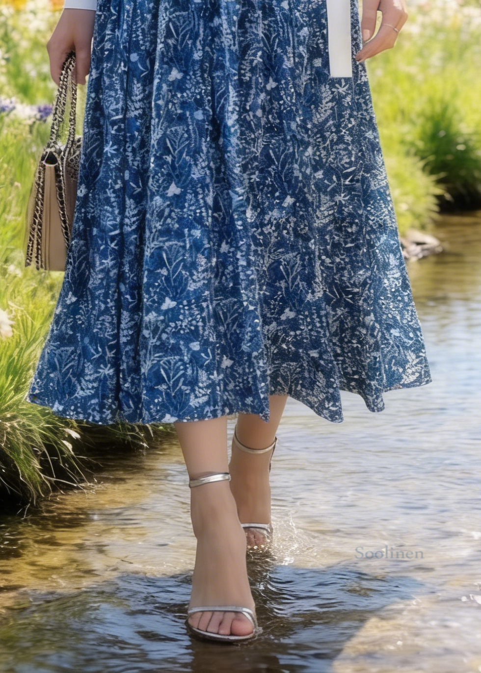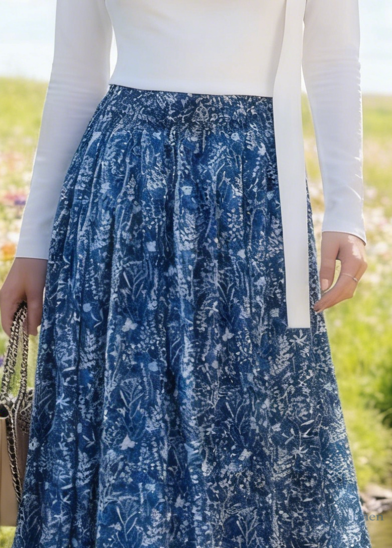Blue Print Cotton Skirt Elastic Waist Summer