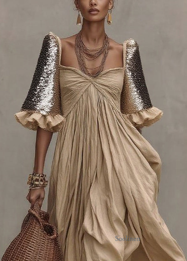 Chic Khaki Wrinkled Patchwork Maxi Dresses Short Sleeve