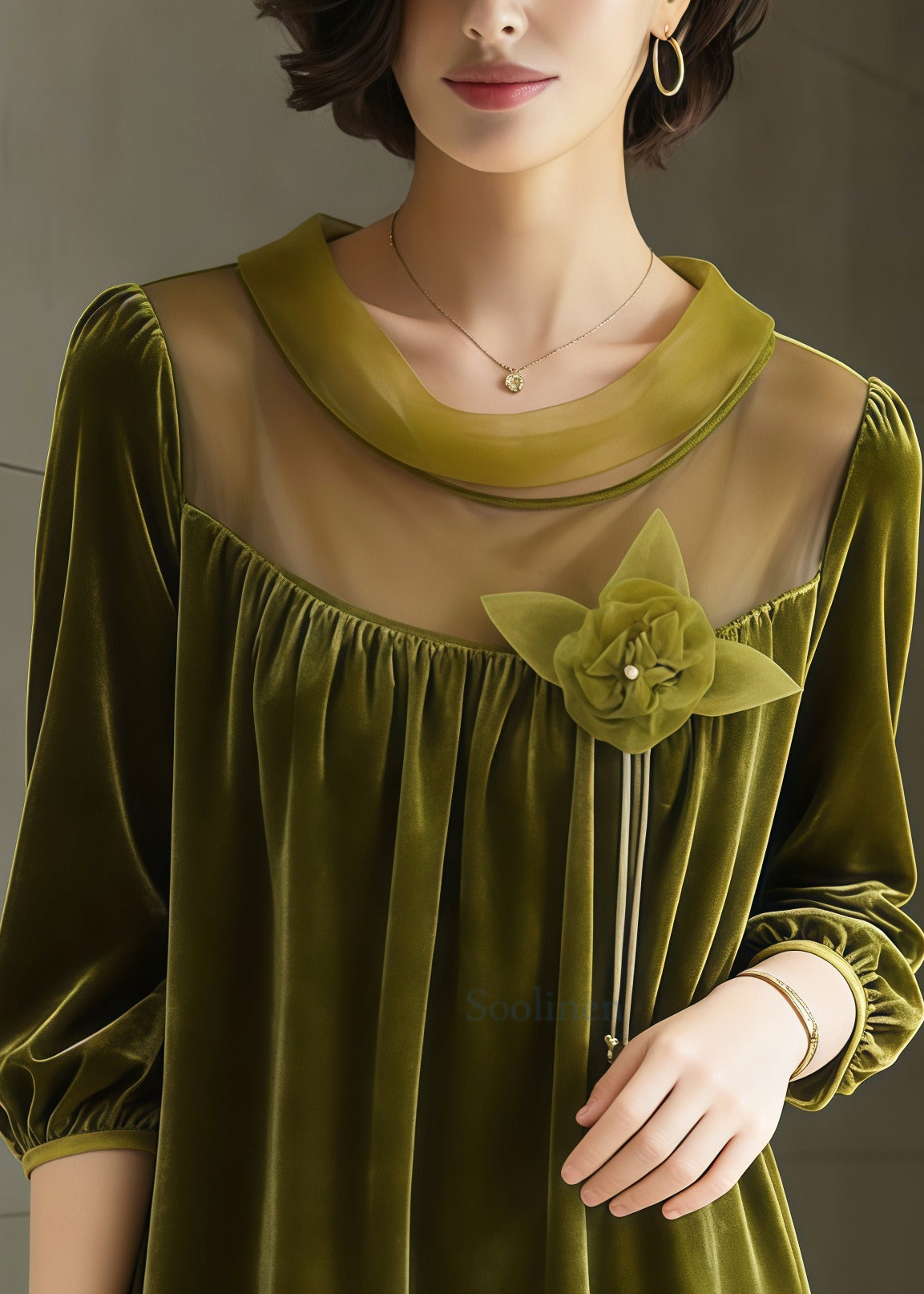 Fitted Grass Green Oversized Patchwork Silk Velvet Tea Dress Half Sleeve