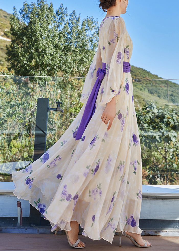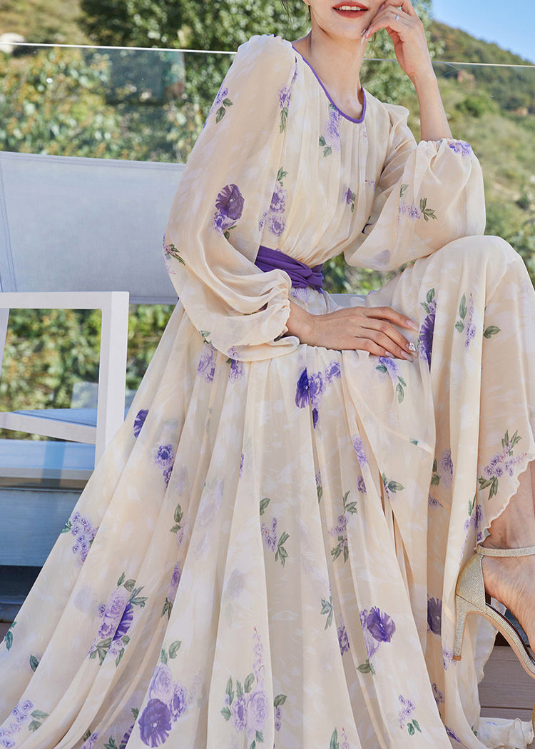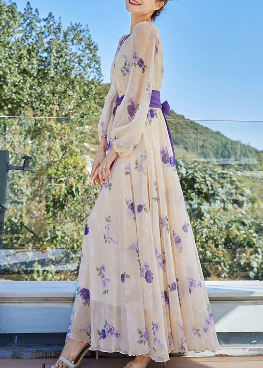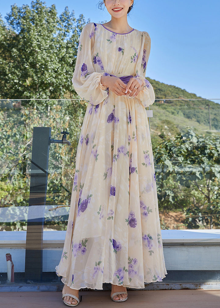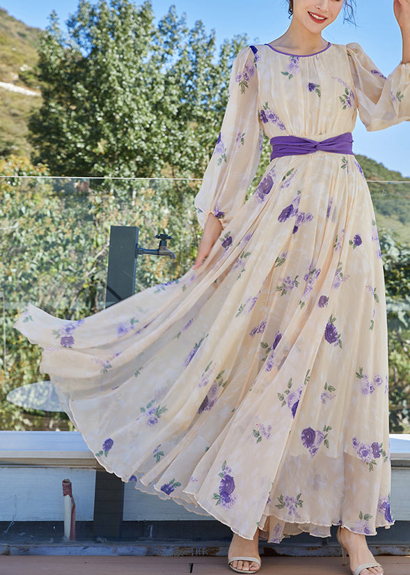 French Apricot Yellow O-Neck Print Tunic Bow Chiffon Holiday Maxi Dresses Spring