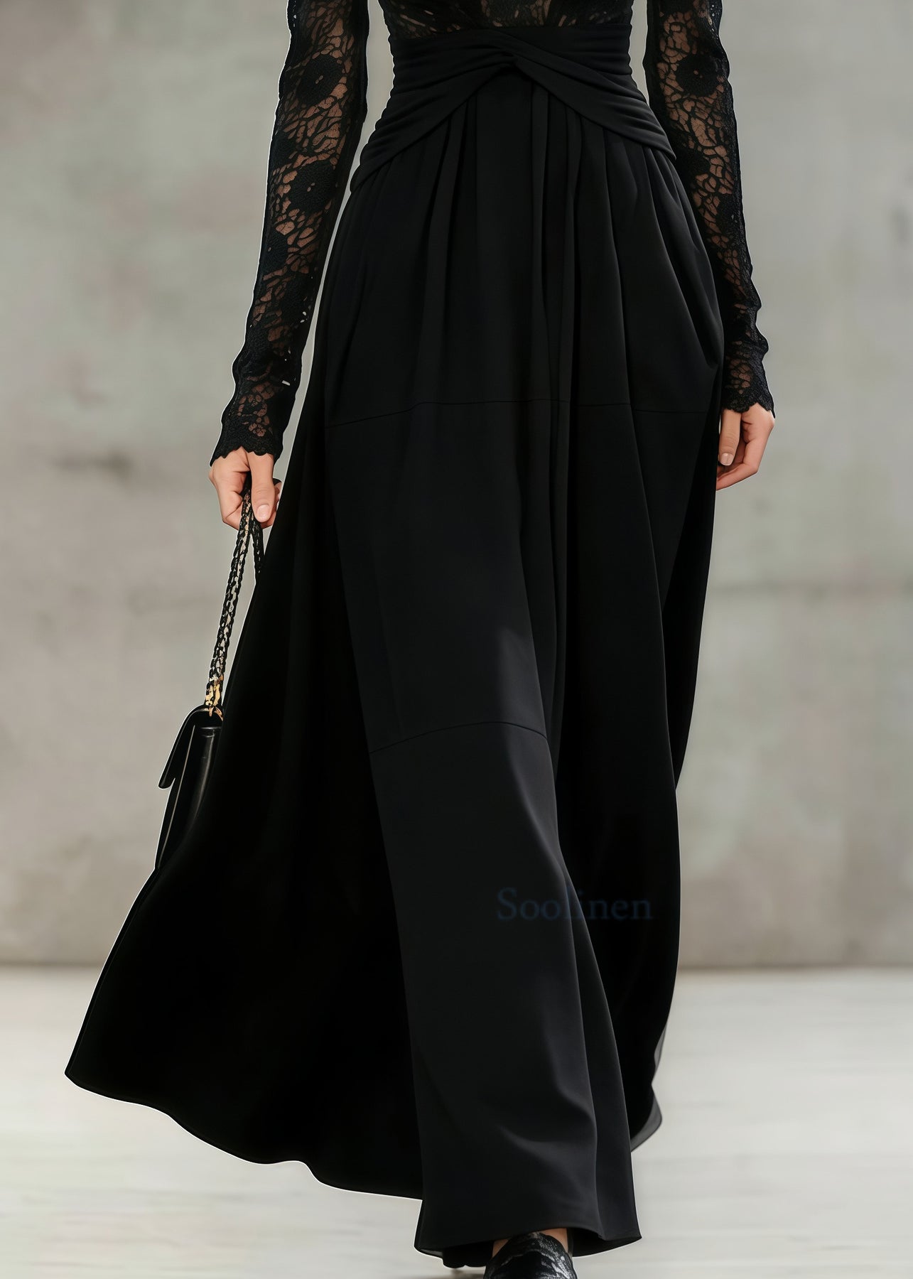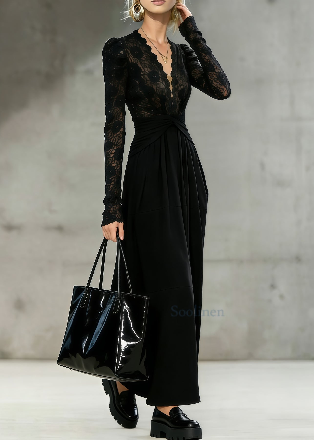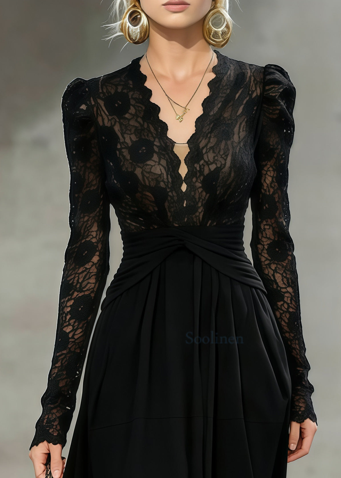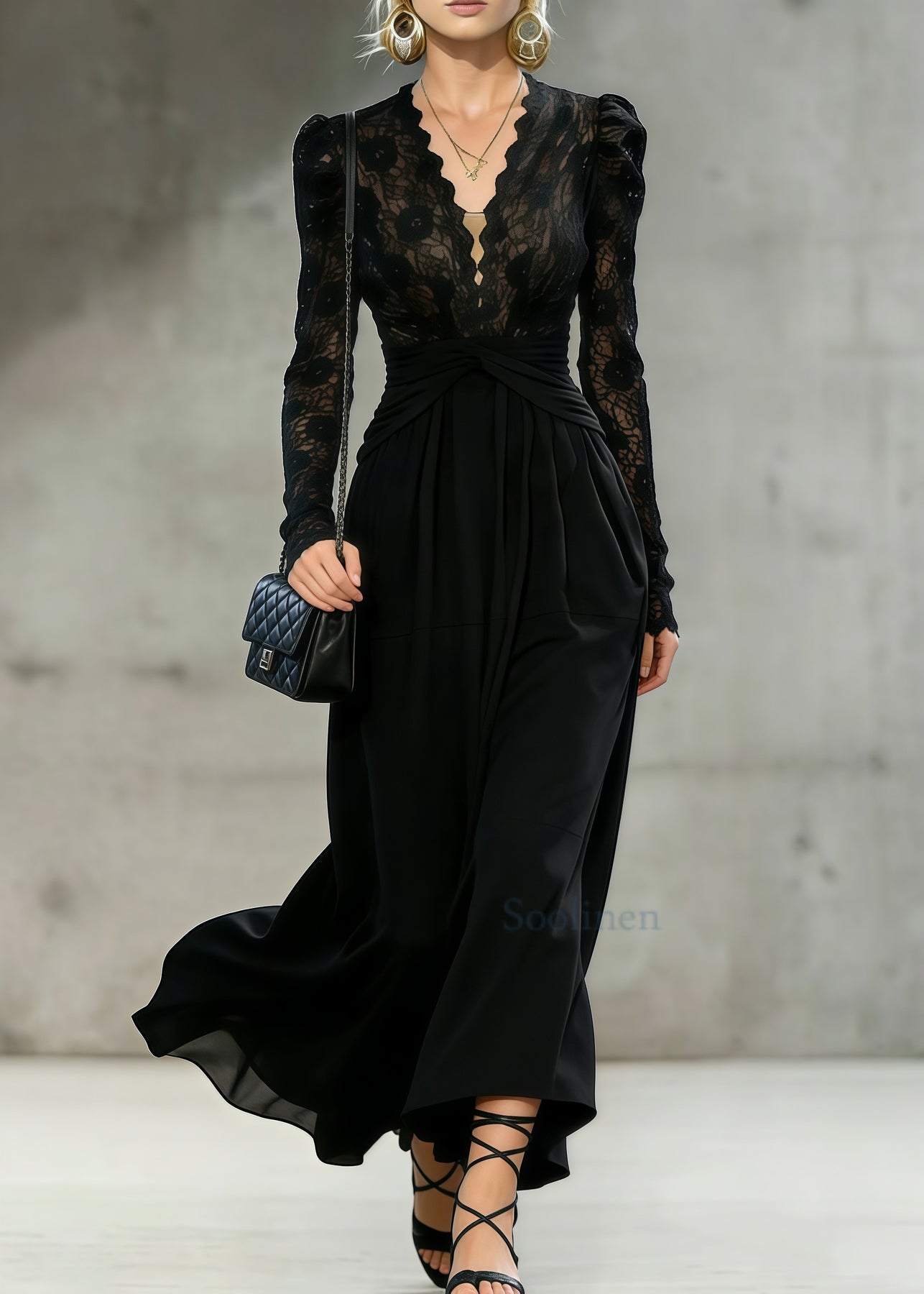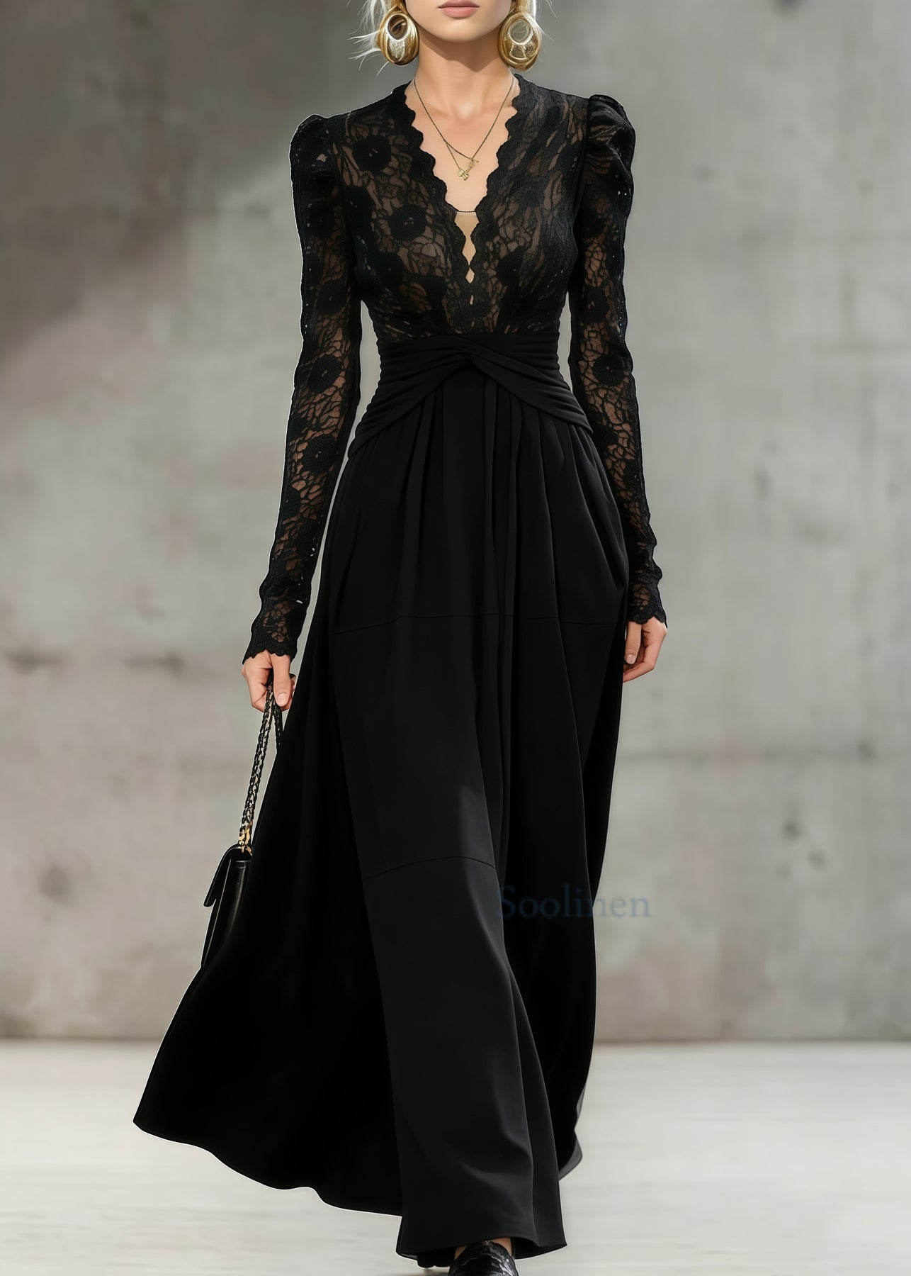 French Black Cinched Patchwork Lace Long Dresses Spring