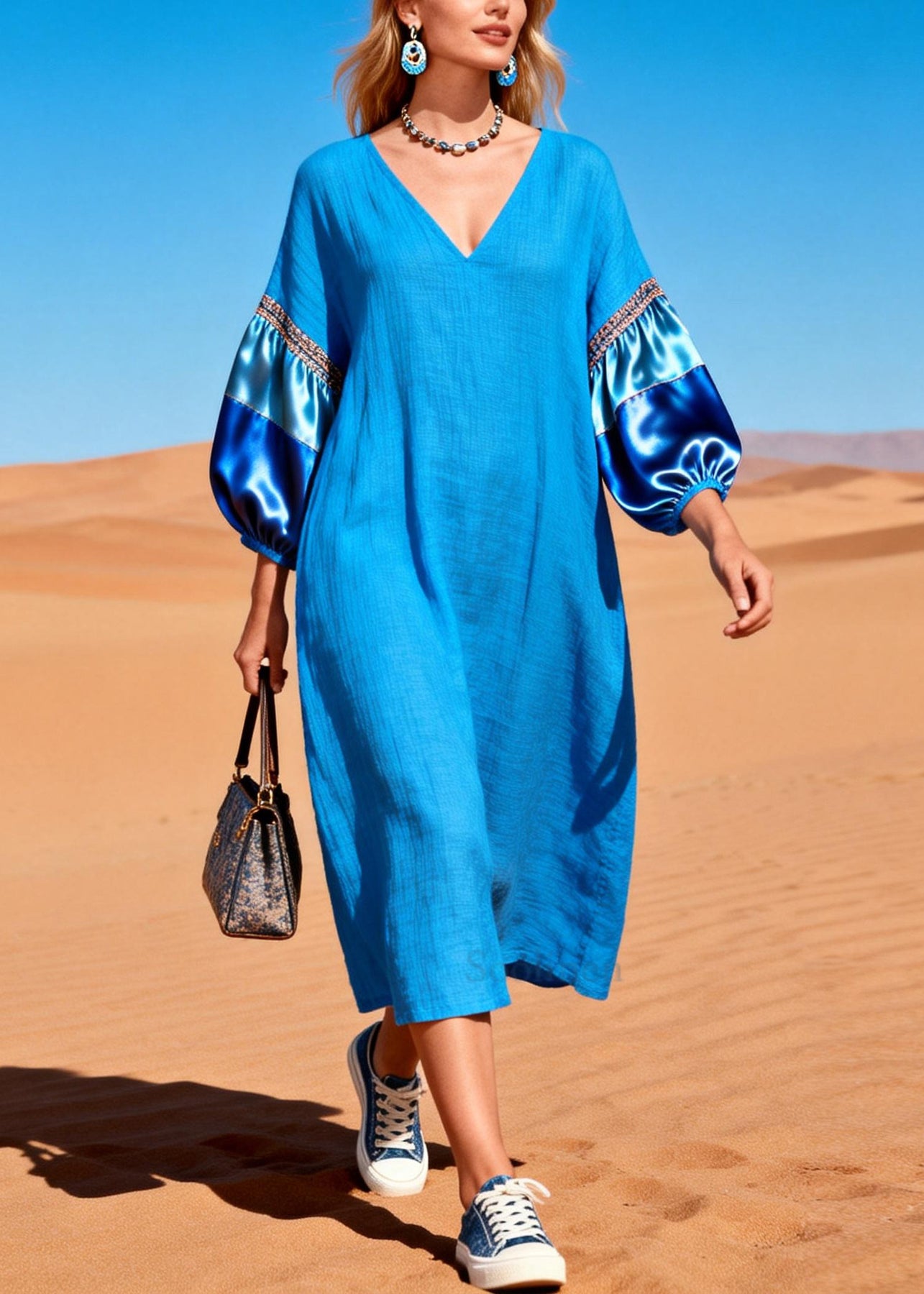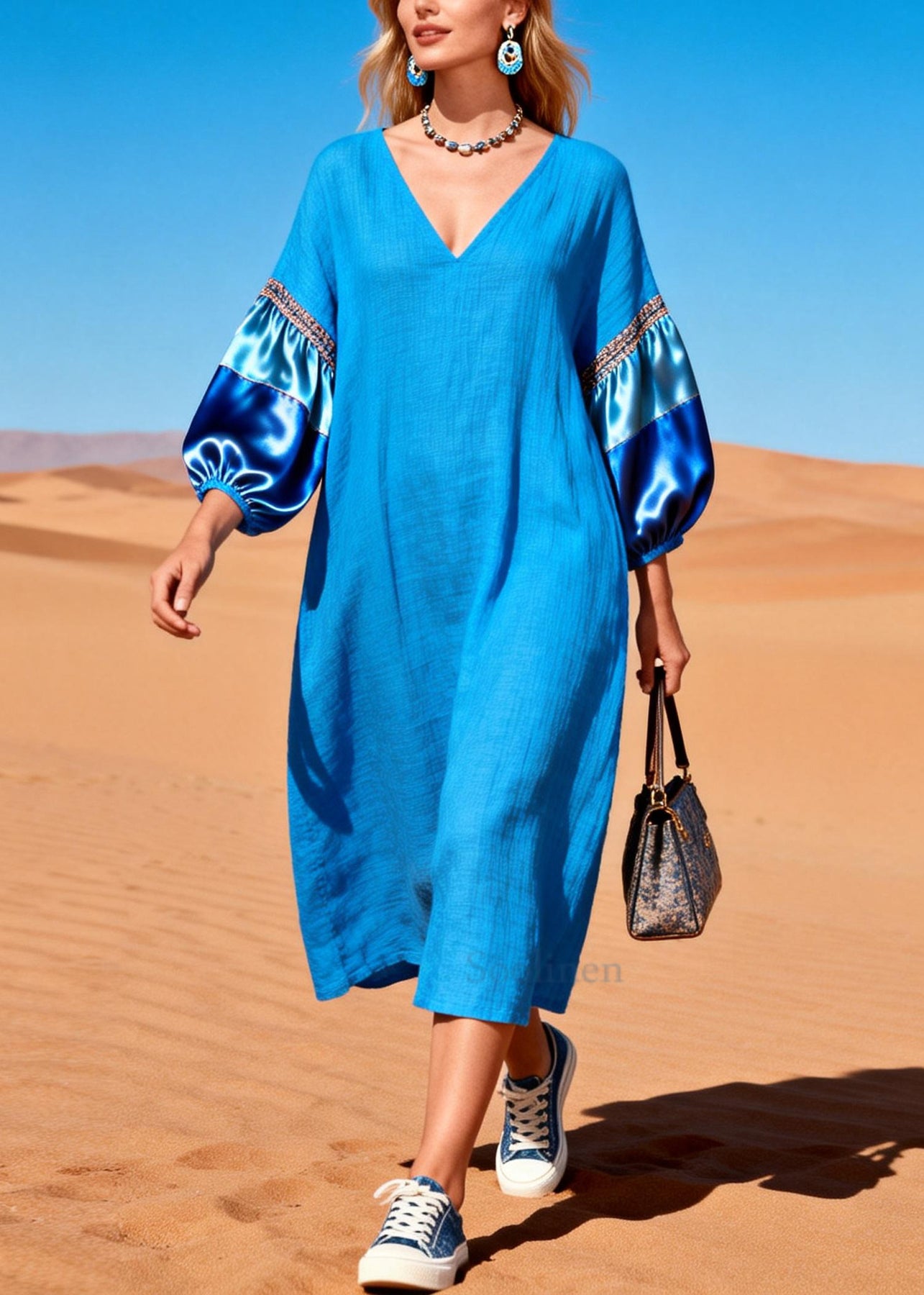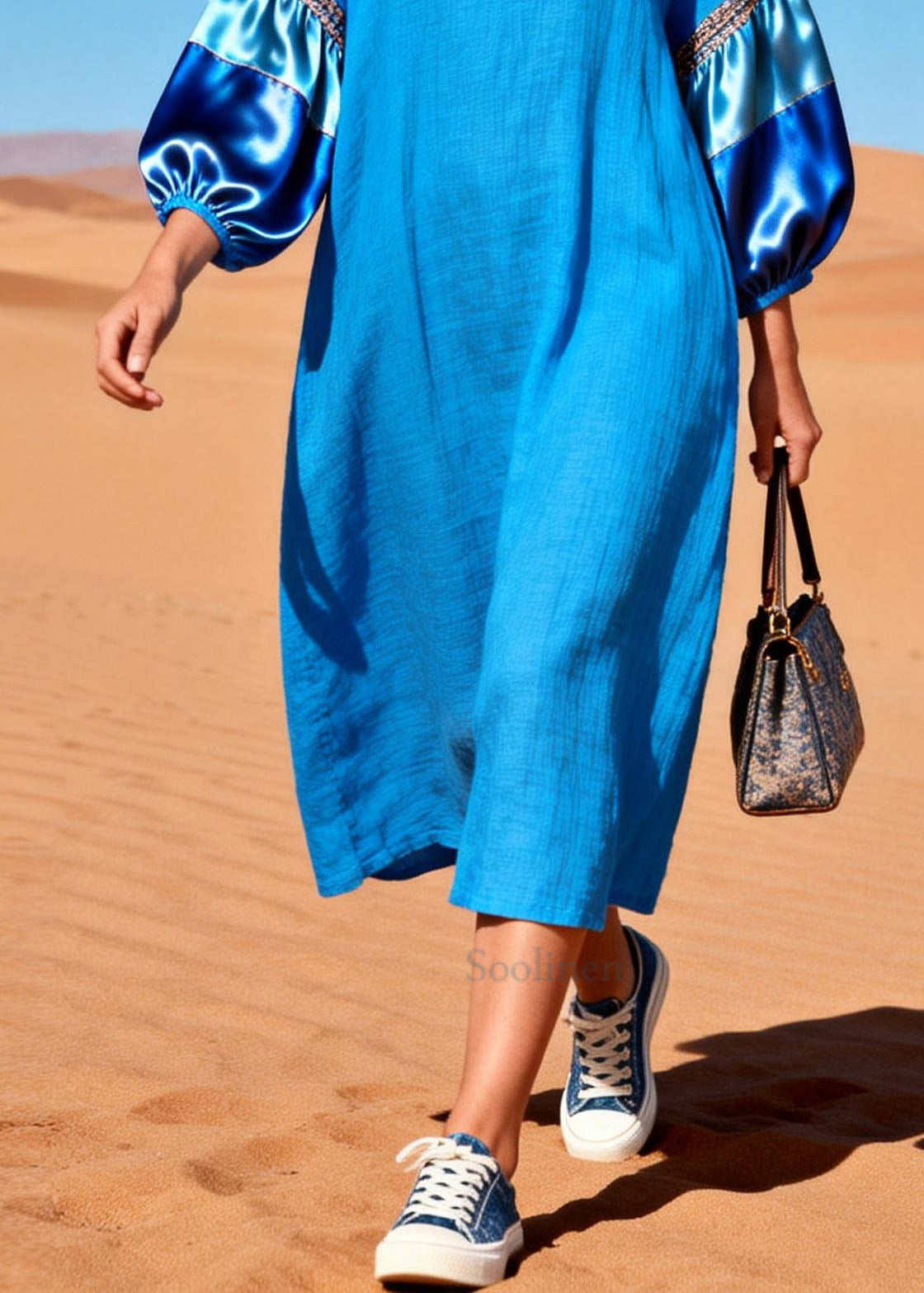 French Blue Oversized Patchwork Cotton Dresses Lantern Sleeve