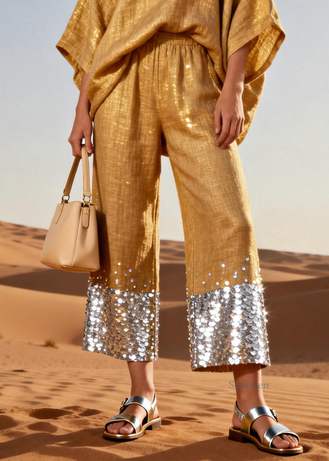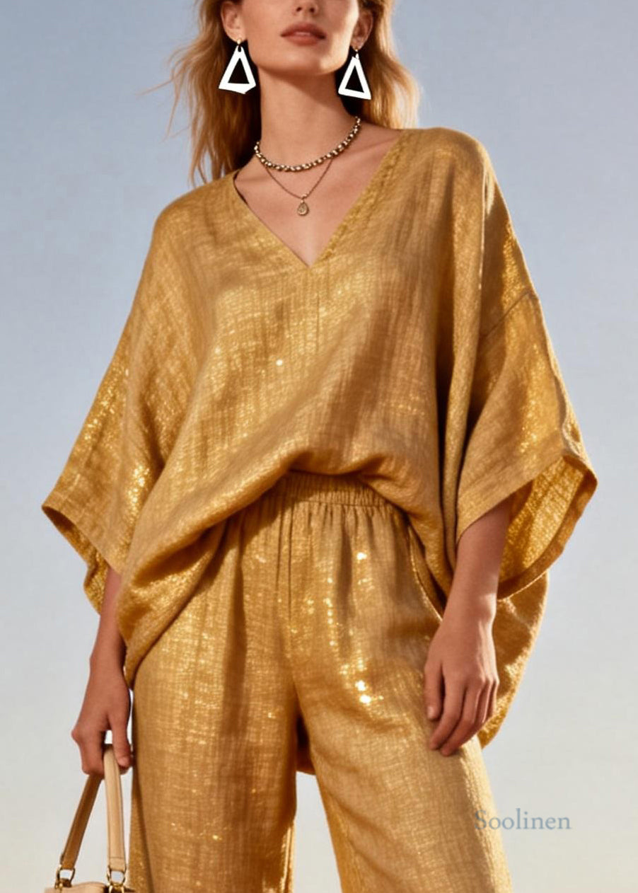 Italian Gold V Neck Elastic Waist Sequins Patchwork Linen Two Pieces Set Batwing Sleeve