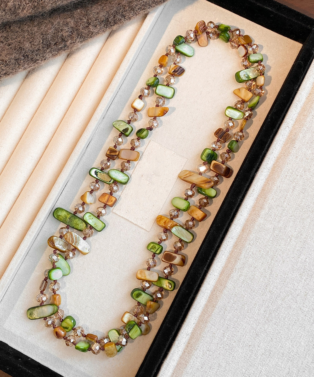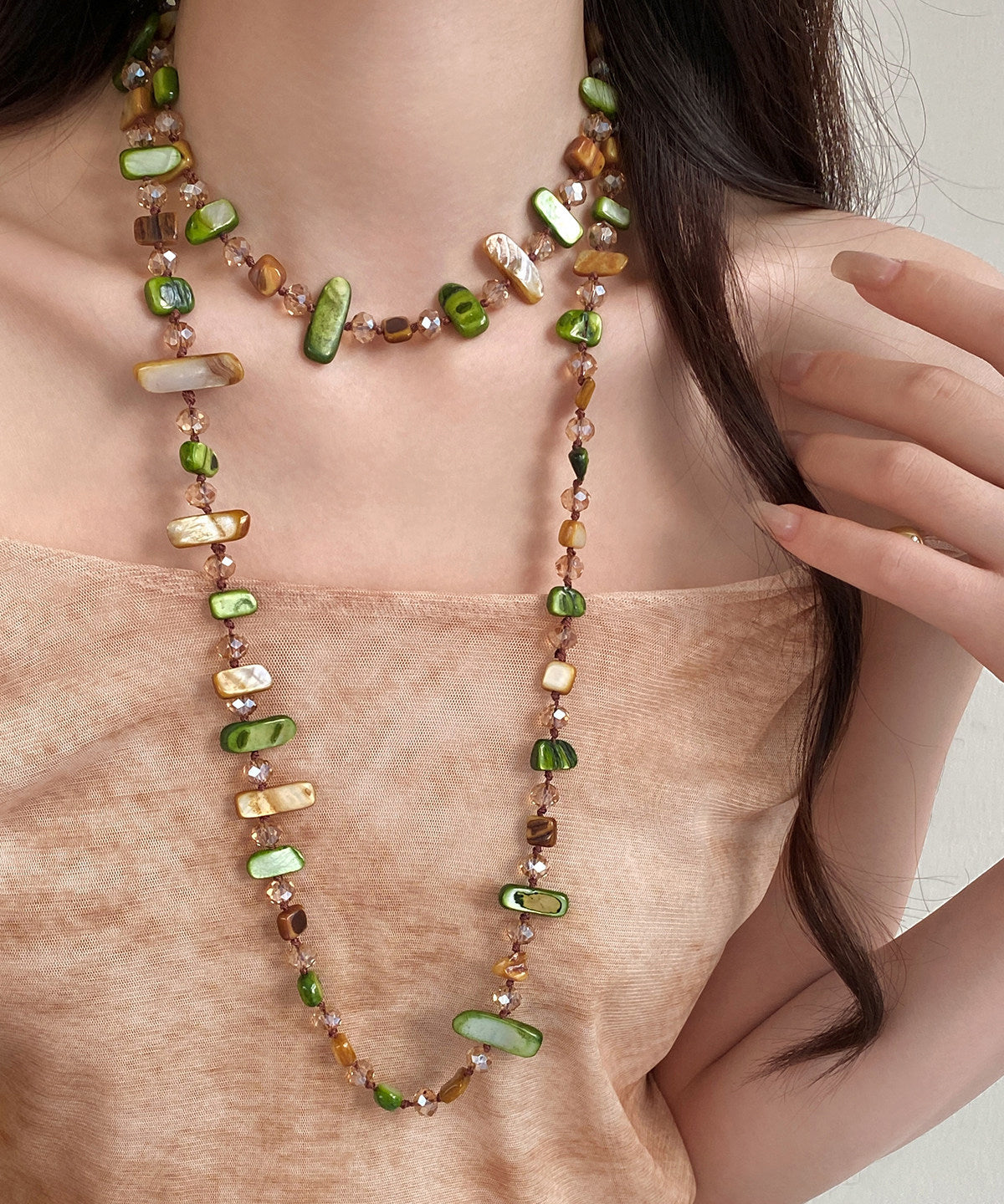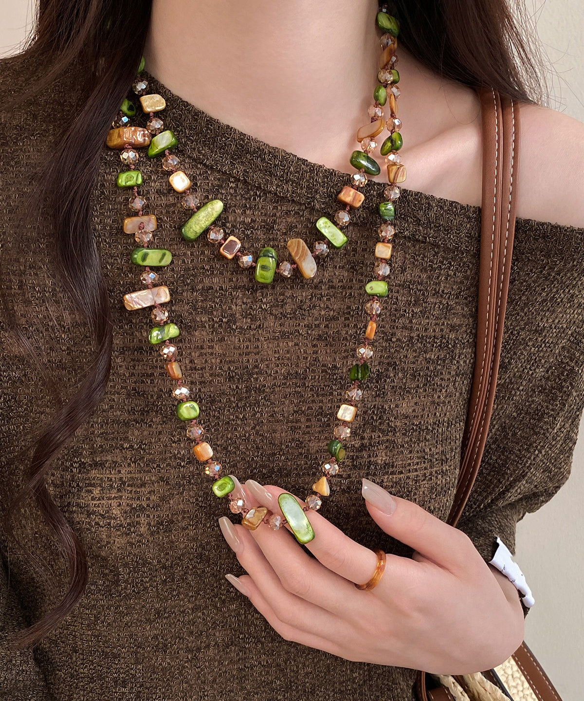 Modern Coffee Green Alloy Shell Natural Stone Sweater Gratuated Bead Necklace