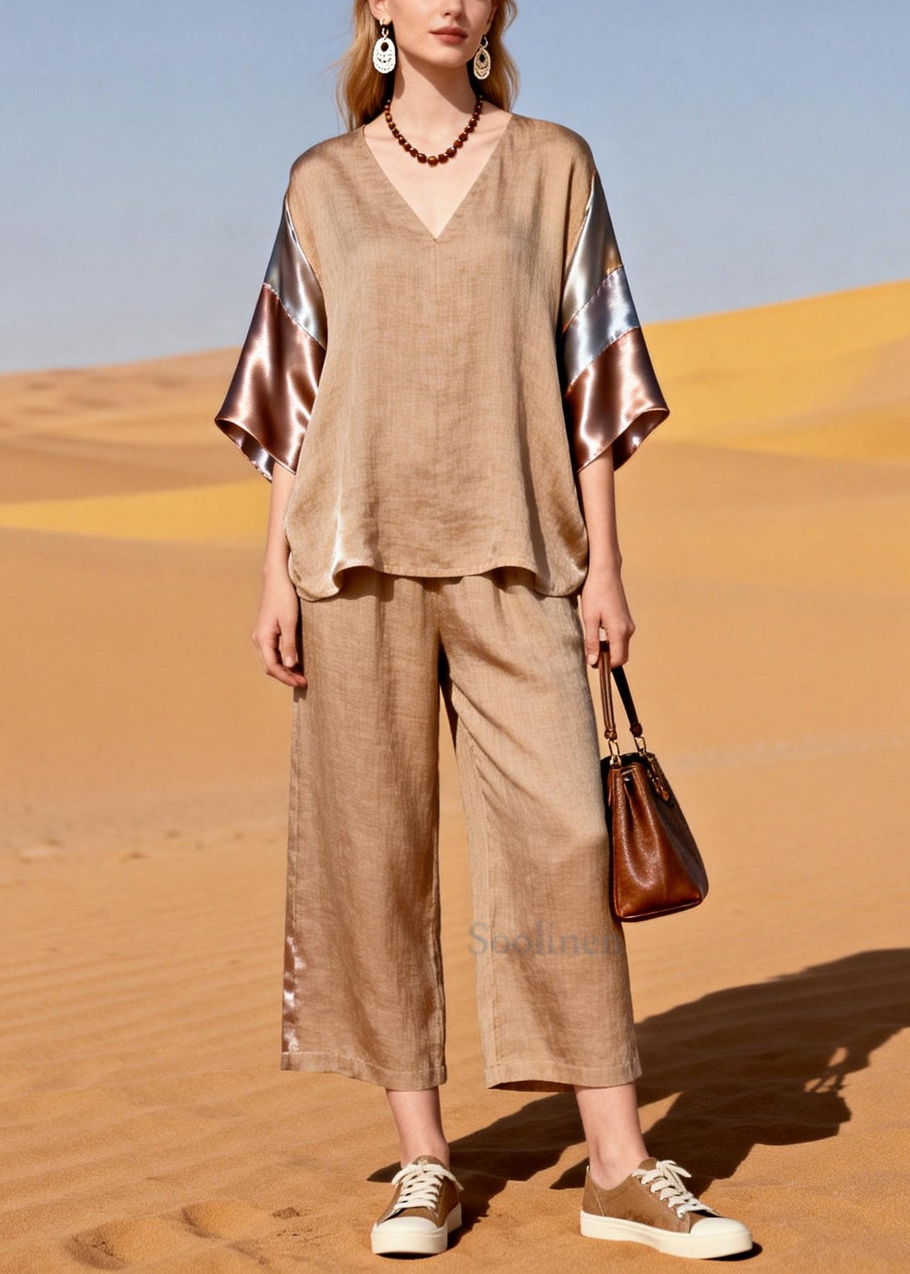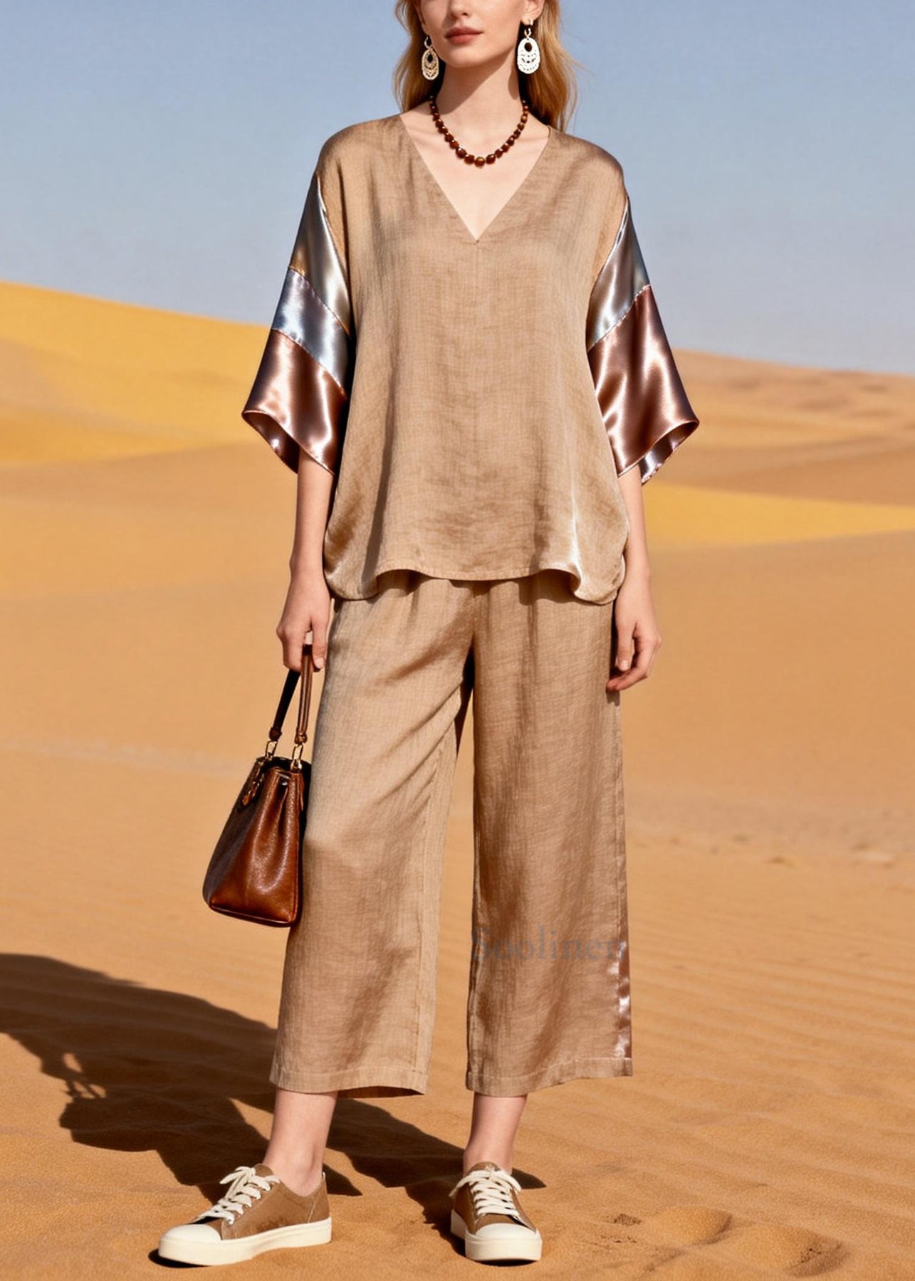 Natural Khaki Oversized Patchwork Silk Linen Two Piece Set Outfits Summer