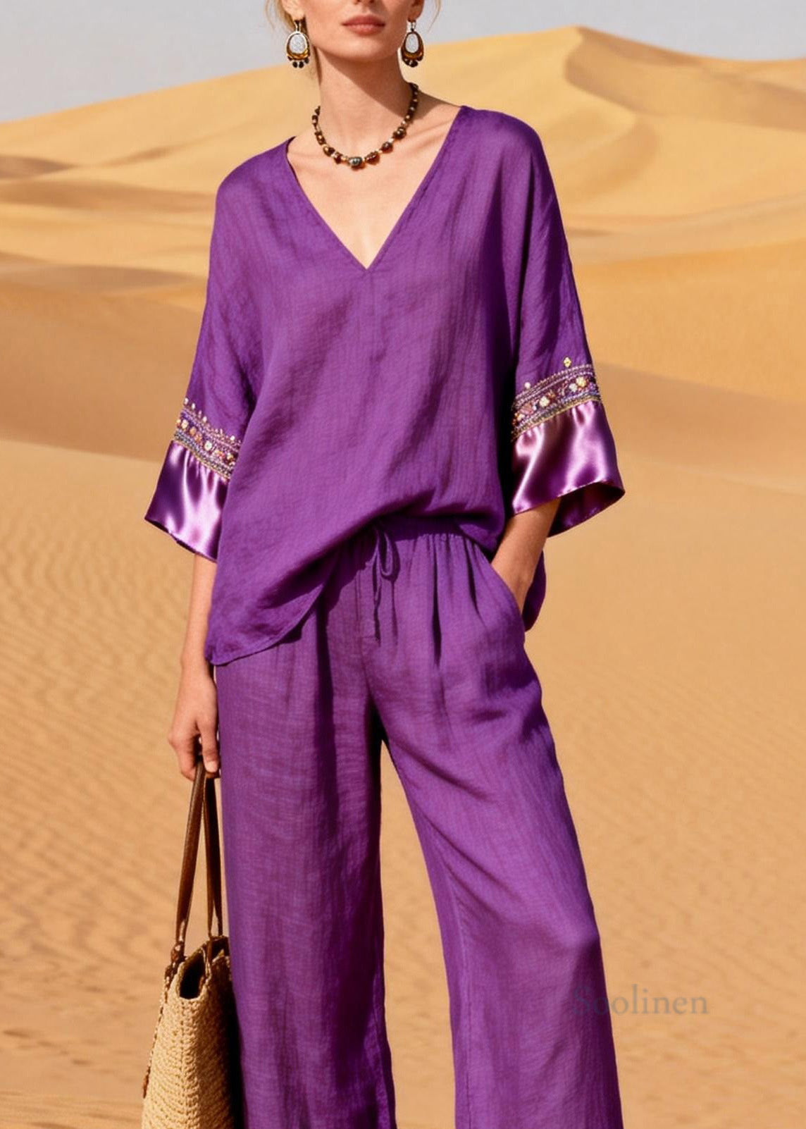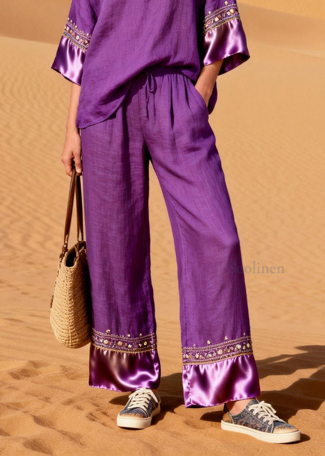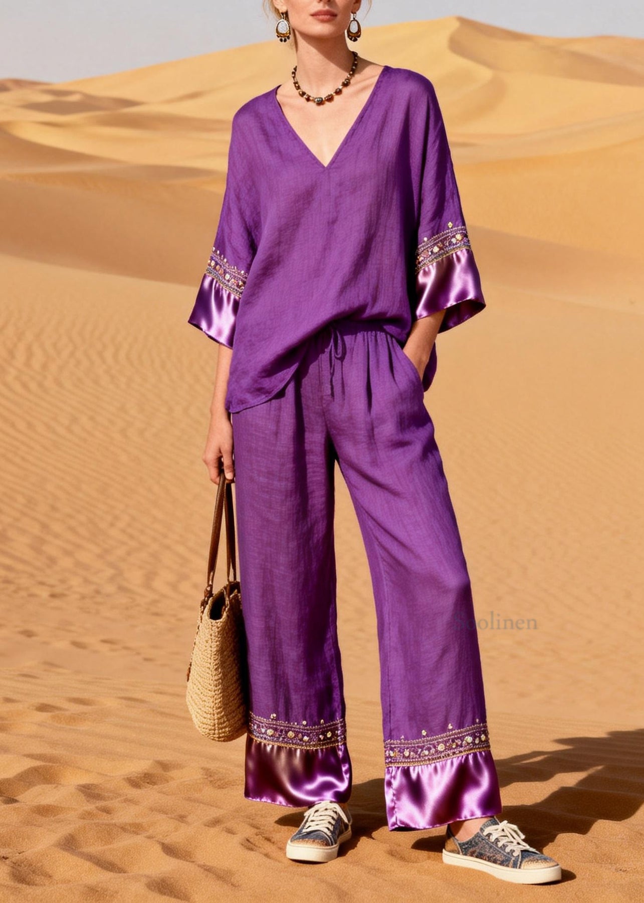 New Purple V Neck Silk Patchwork Linen Two Piece Suit Set Summer